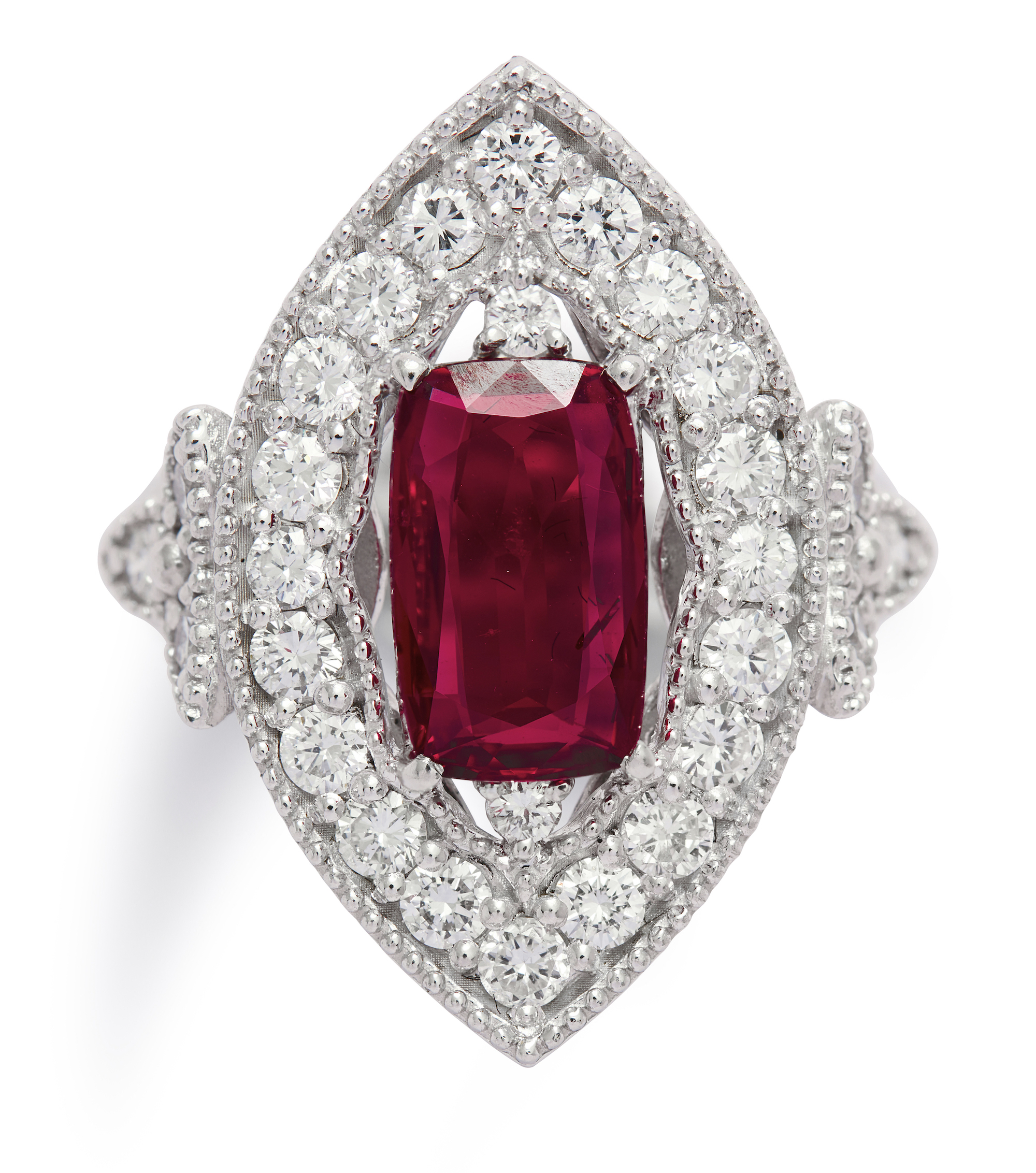 Centring a claw-set cushion-shaped ruby weighing 2.00 carats, framed by a lozenge-shaped millegrain surround decorated with brilliant-cut diamonds, supported by similarly set shoulders, the diamonds together weighing approximately 1.10 carats, size K1/2.