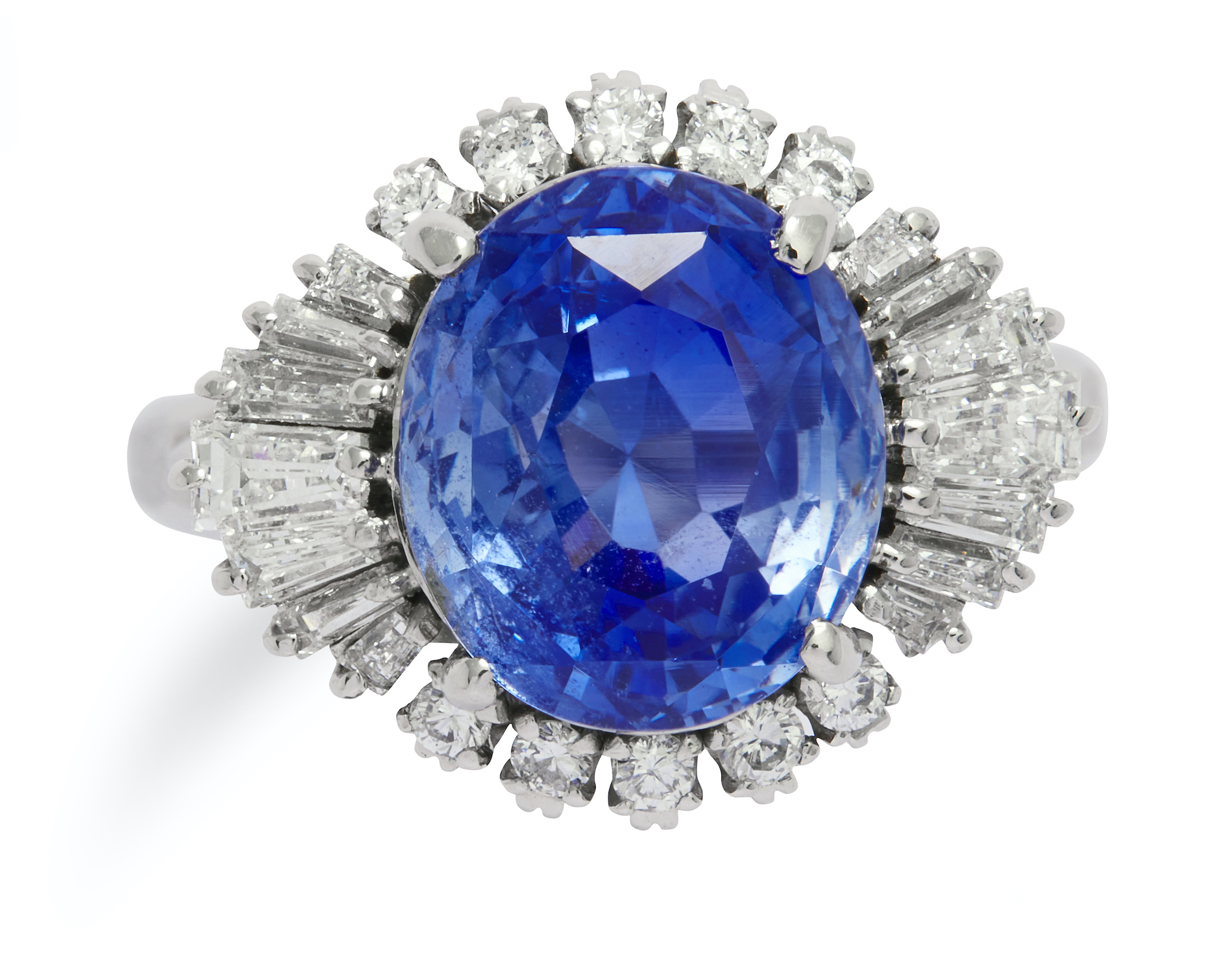 Of cluster design, centring a claw-set oval step-cut sapphire weighing 6.66 carats, framed above a surround of brilliant-cut and tapered baguette diamonds together weighing approximately 0.80 carats, size M.