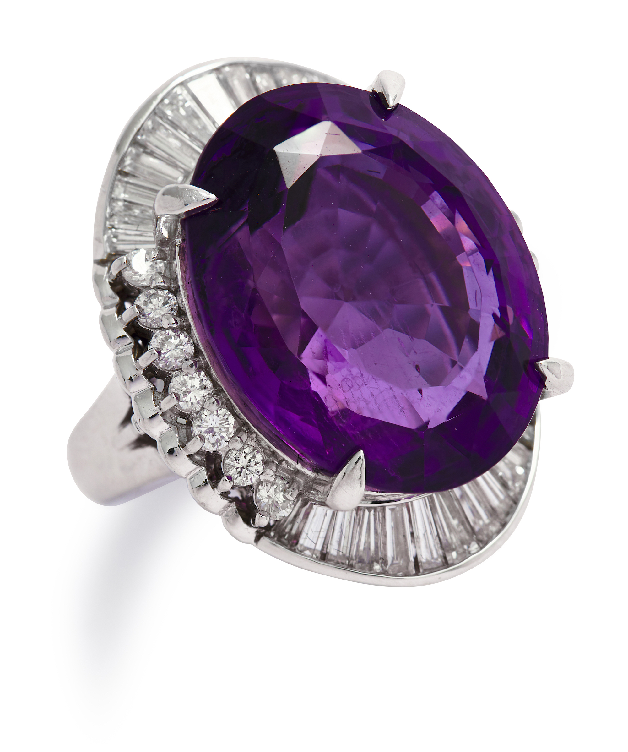 Centring a claw-set oval amethyst weighing approximately 18.24 carats, framed by an undulating line of brilliant-cut and baguette diamonds, the diamonds together weighing approximately 1.40 carats, size K.