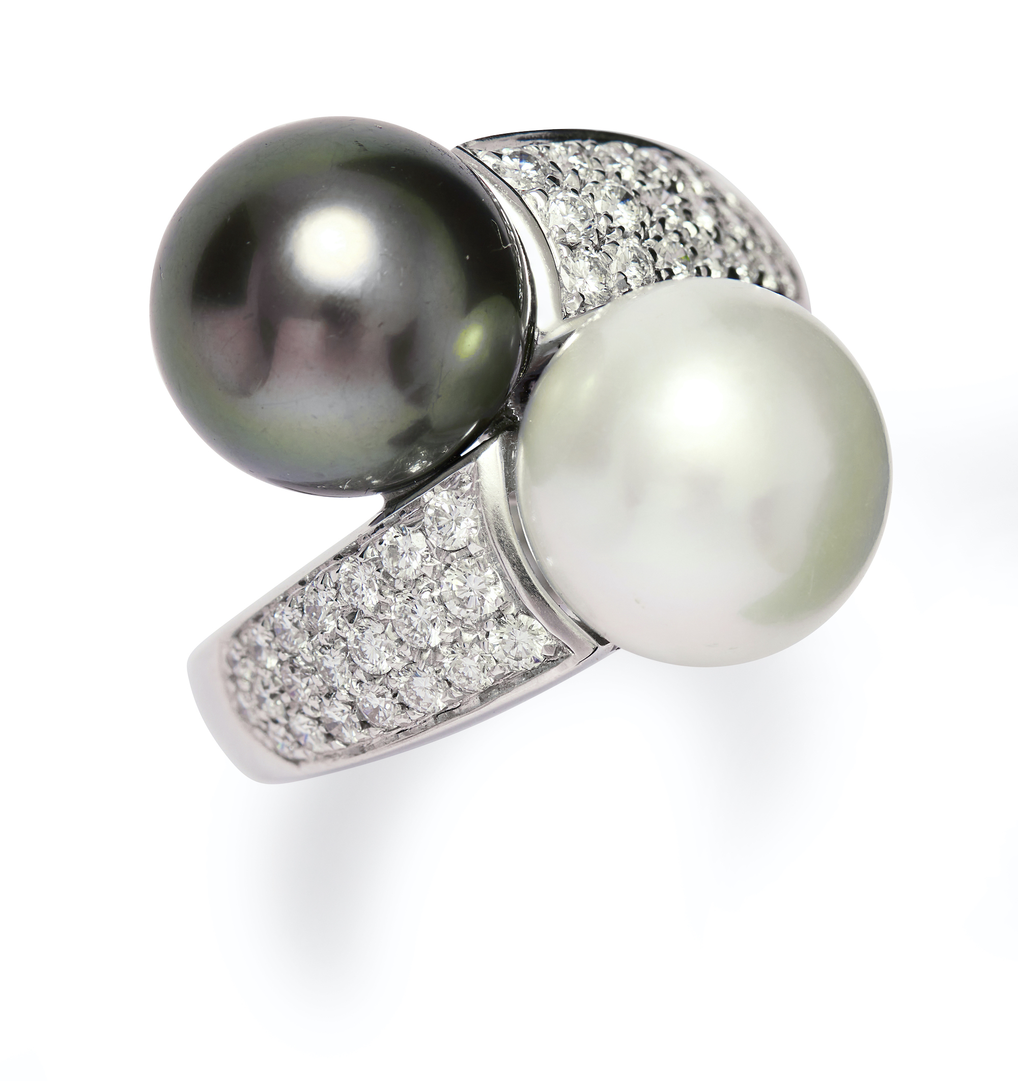 Of toi et moi design, terminating in a white cultured pearl and a black Tahitian cultured pearl, the shoulders pavé-set with brilliant-cut diamonds, size 53 (Q1/2), signed Boucheron, numbered B952 34850.