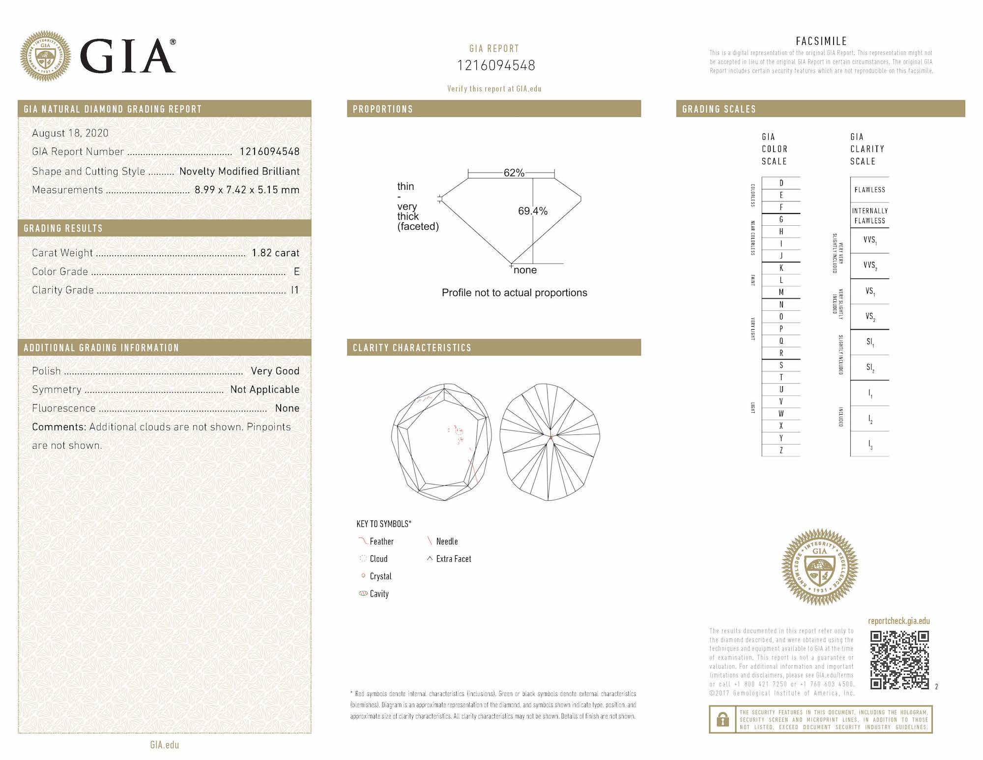 a GIA report numbered 1216094548, dated 18 August 2020, stating that the 1.82 carat diamond is E colour, I1 clarity;