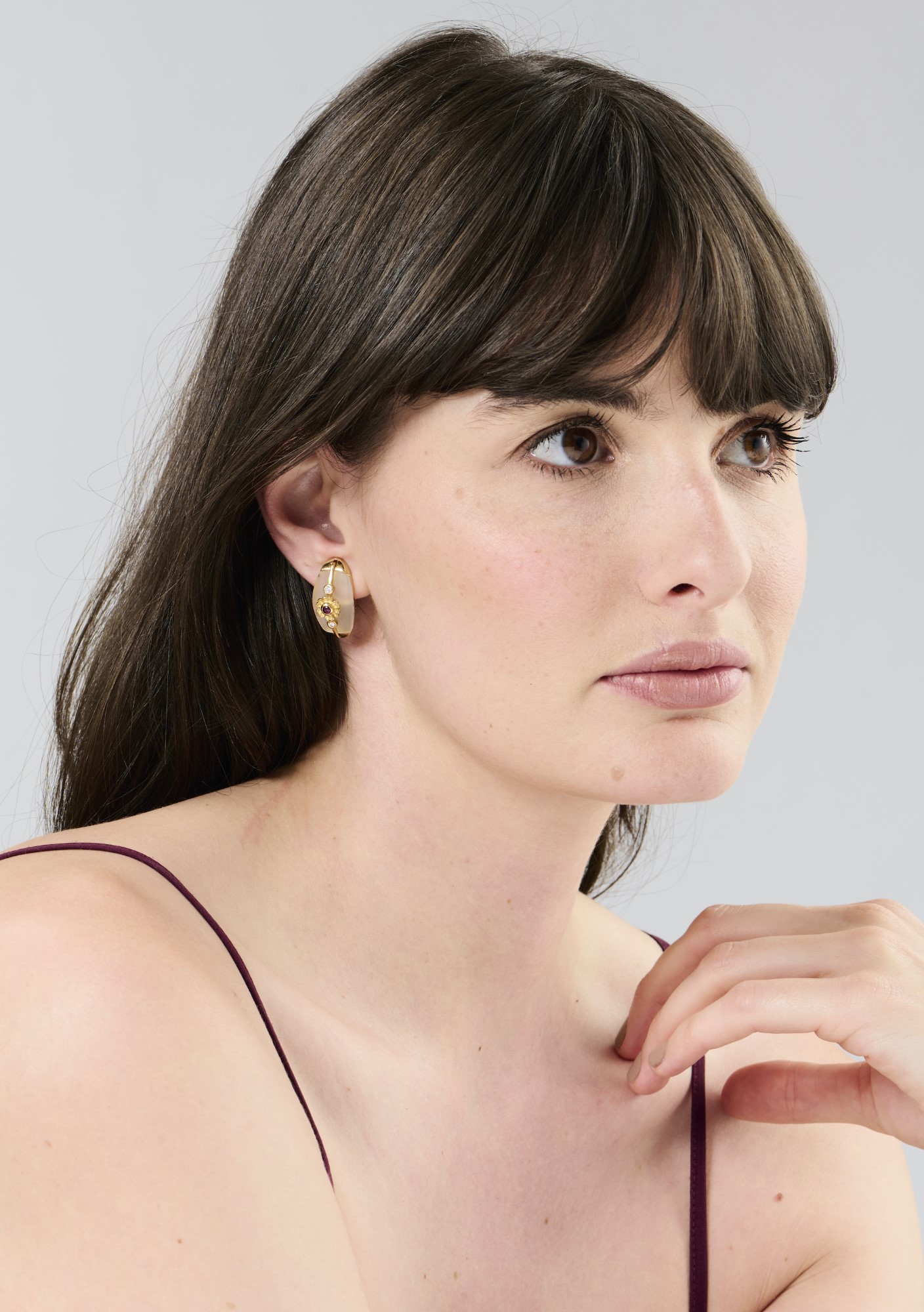 Each tapering elliptical hoop centring a bombe rock crystal plaque accented with gold terminals applied with a gold flowerhead collet-set with a cabochon ruby flanked by a similarly set brilliant-cut diamond, approximately 27mm x 13mm, numbered A21, maker's mark for Ilias Lalaounis.
