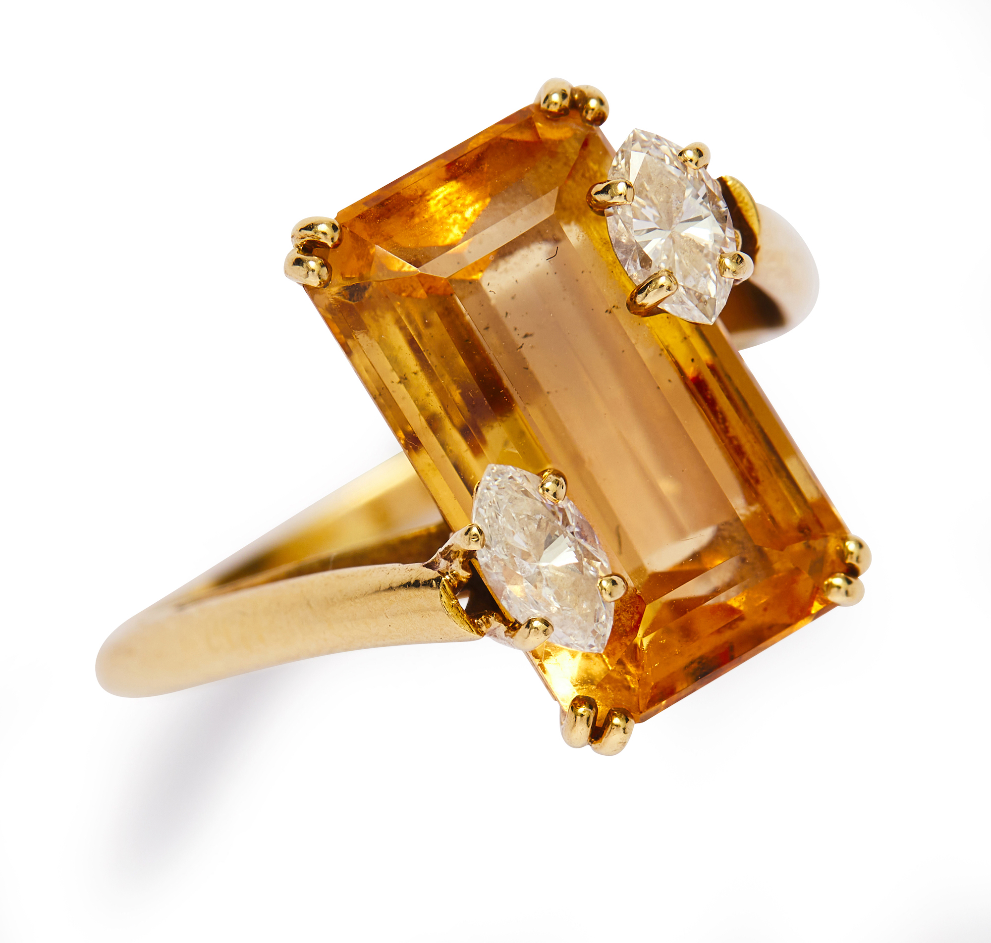 Centring an emerald-cut Imperial golden topaz weighing approximately 5.50 carats, claw-set between crossover shoulders accented with a marquise-shaped diamond, the diamonds together weighing approximately 0.30 carat, size N, signed Chaumet, Paris, 11722.