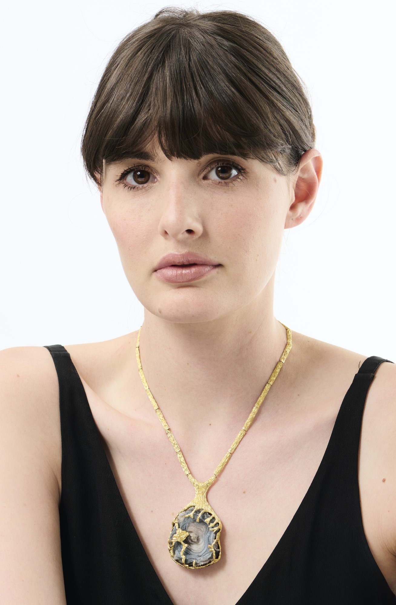 Comprising of a line of textured half round rectangular links supporting a druzy quartz agate framed by an organic surround, pendant length approximately 65mm x 40mm, circumference approximately 430mm, maker's mark by H. Stern.