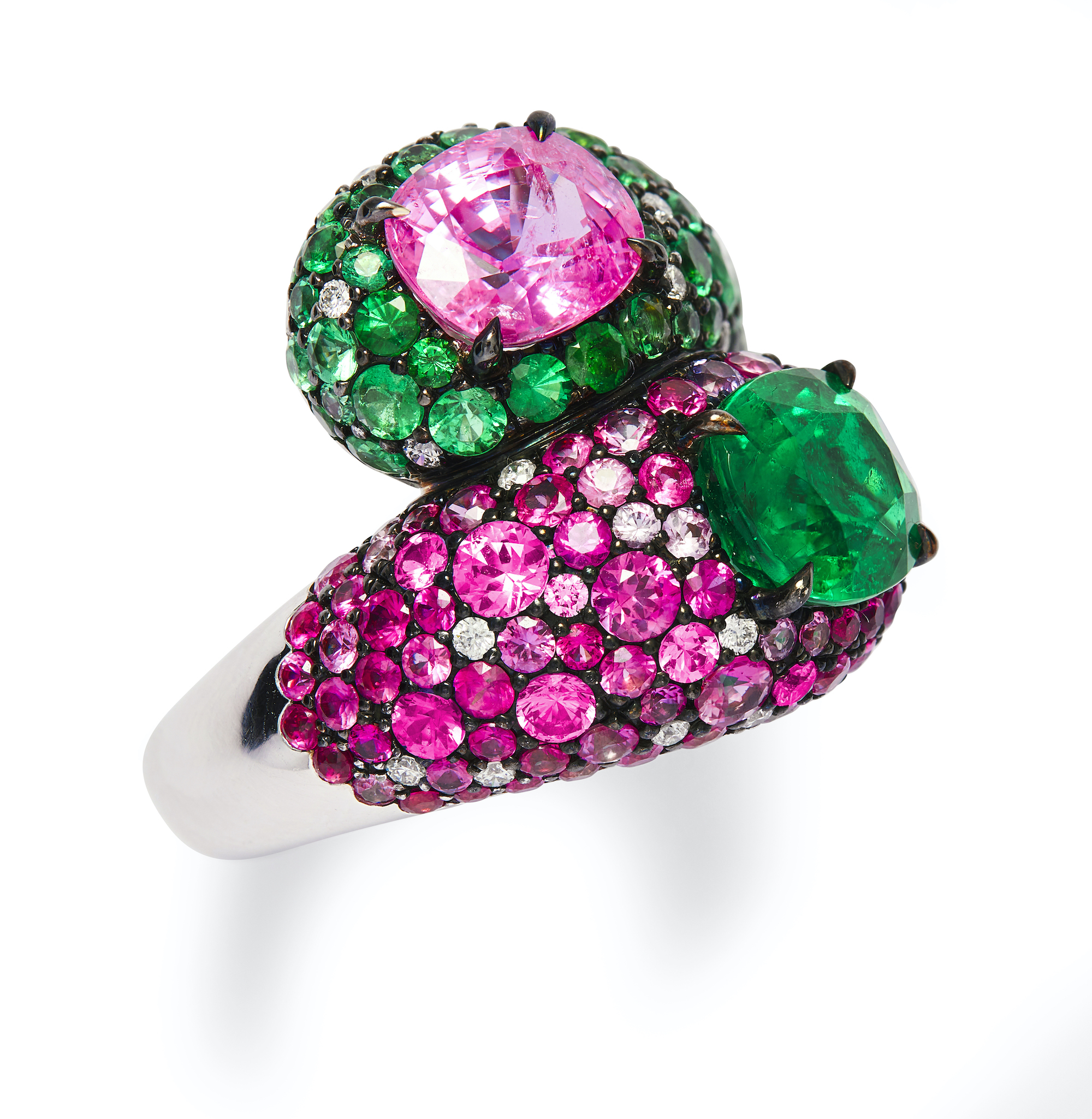 Of toi et moi design with bombe terminals, one claw-set with a cushion-shaped emerald weighing 2.56 carats framed by pavé-set brilliant-cut diamonds between circular-cut pink sapphires, the other claw-set with a cushion-shaped pink sapphire weighing 2.60 carats framed by pavé-set diamonds between circular-cut emeralds in blackened gold, the small emeralds, sapphires and diamonds together weighing 2.03 carats, 2.66 carats and 0.26 carats respectively, size N1/2.