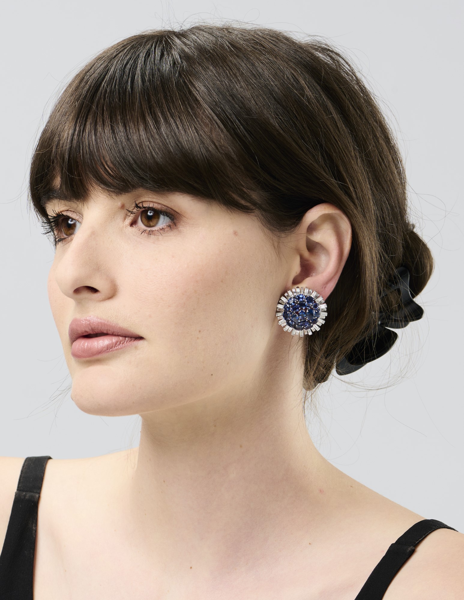 Each of cluster design, claw-set with 19 variously cut blue sapphires, bordered by 34 baguette-cut diamonds, the sapphires and diamonds together weighing approximately 14.71 carats and 4.44 carats respectively, diameter approximately 28mm, post and clip fittings.