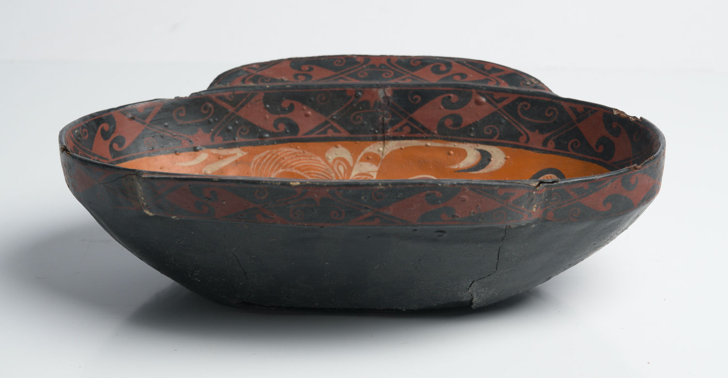 Painted to the interior with birds against an orange ground, to the borders with curvilinear abstracted archaic designs in red against a black ground. Possible later painting.