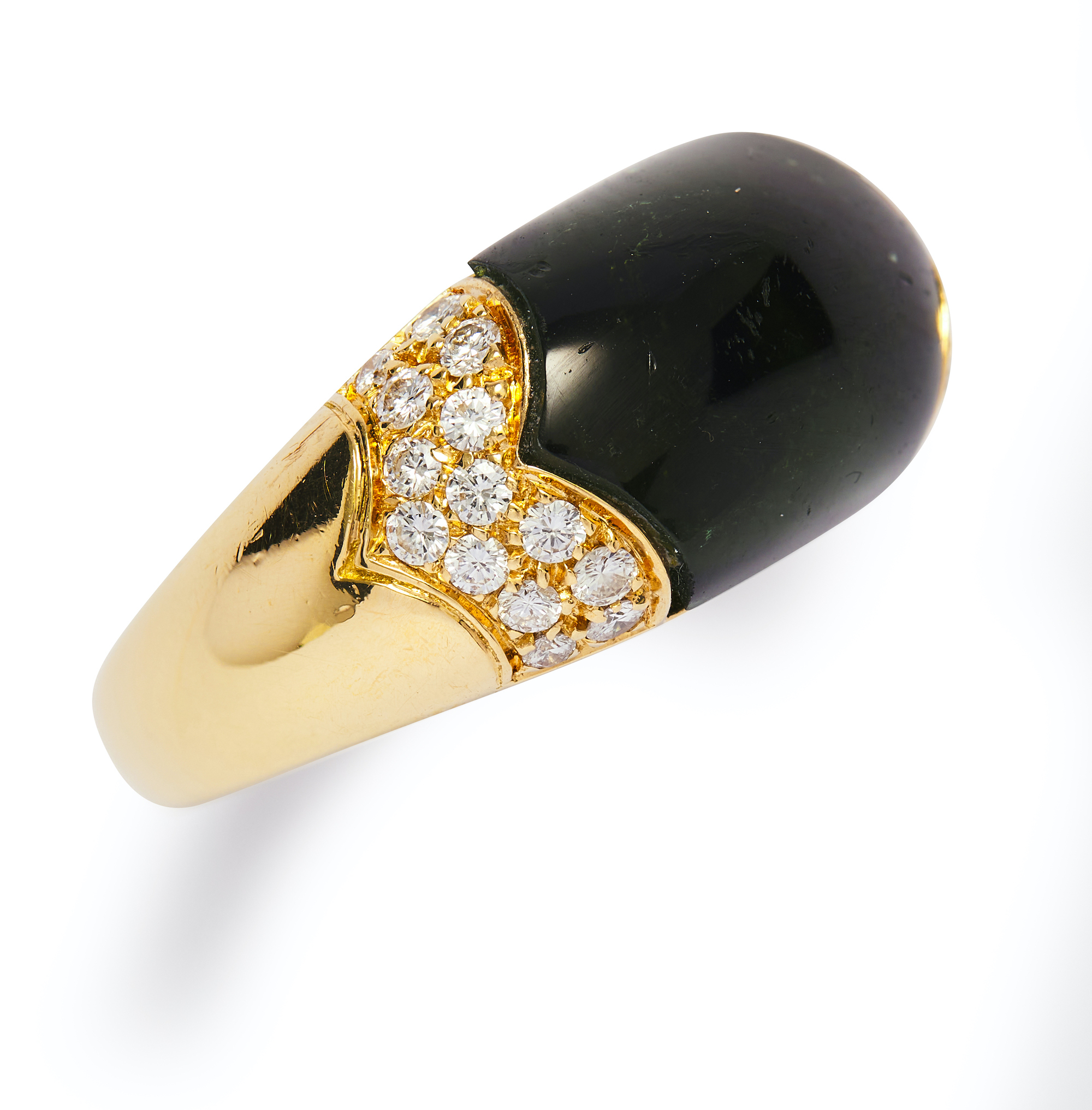 Of bombe form collet-set with a cabochon green tourmaline flanked by pavé-set brilliant-cut diamonds, size M, signed Bulgari, numbered 2337A1, Italian registration and maker's marks.