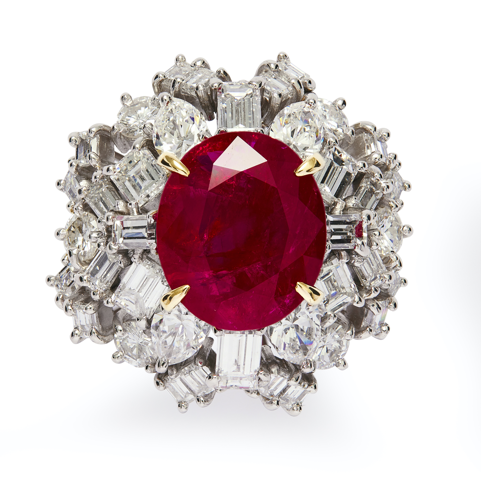 Of bombe form, modelled as a cluster, centring an oval red ruby weighing 5.18 carats, claw-set within an openwork asymmeterical surround of baguette, pear-shaped and brilliant-cut diamonds, the diamonds together weighing approximately 3.08 carat, size L1/2.