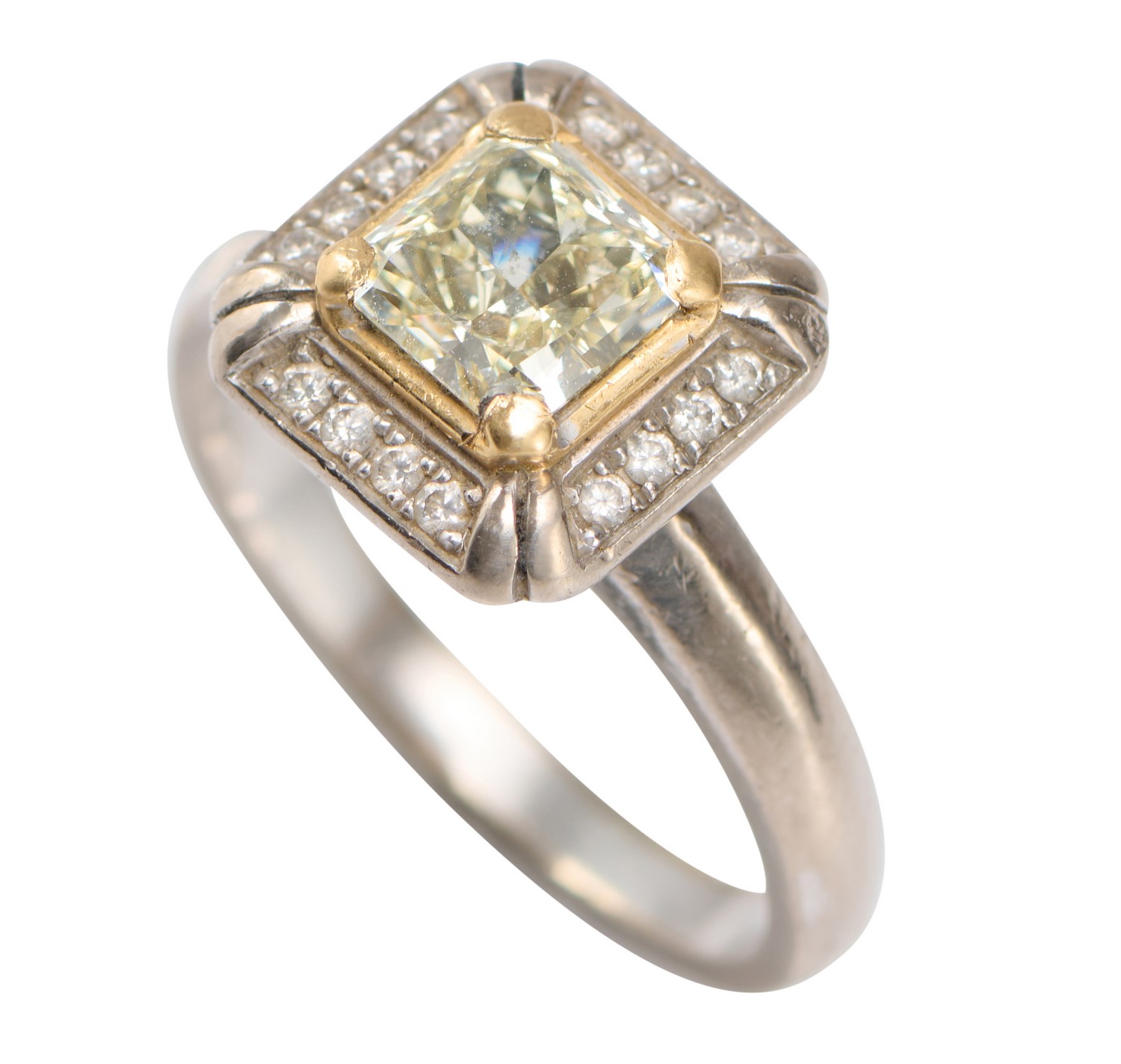 Of cluster design, centring a radiant-cut light yellow diamond weighing 1.16cts, within a square border of sixteen round brilliant-cut diamonds together weighing approximately, ring size J.