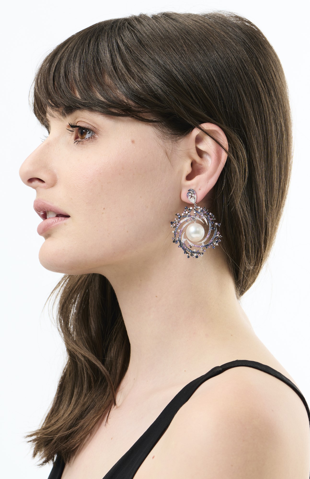 A SPECTACULAR PAIR OF 18CT WHITE GOLD, SAPPHIRE, PINK DIAMOND, BLACK DIAMOND, DIAMOND AND AUSTRALIAN SOUTH SEA PEARL EARRINGS, AUTORE