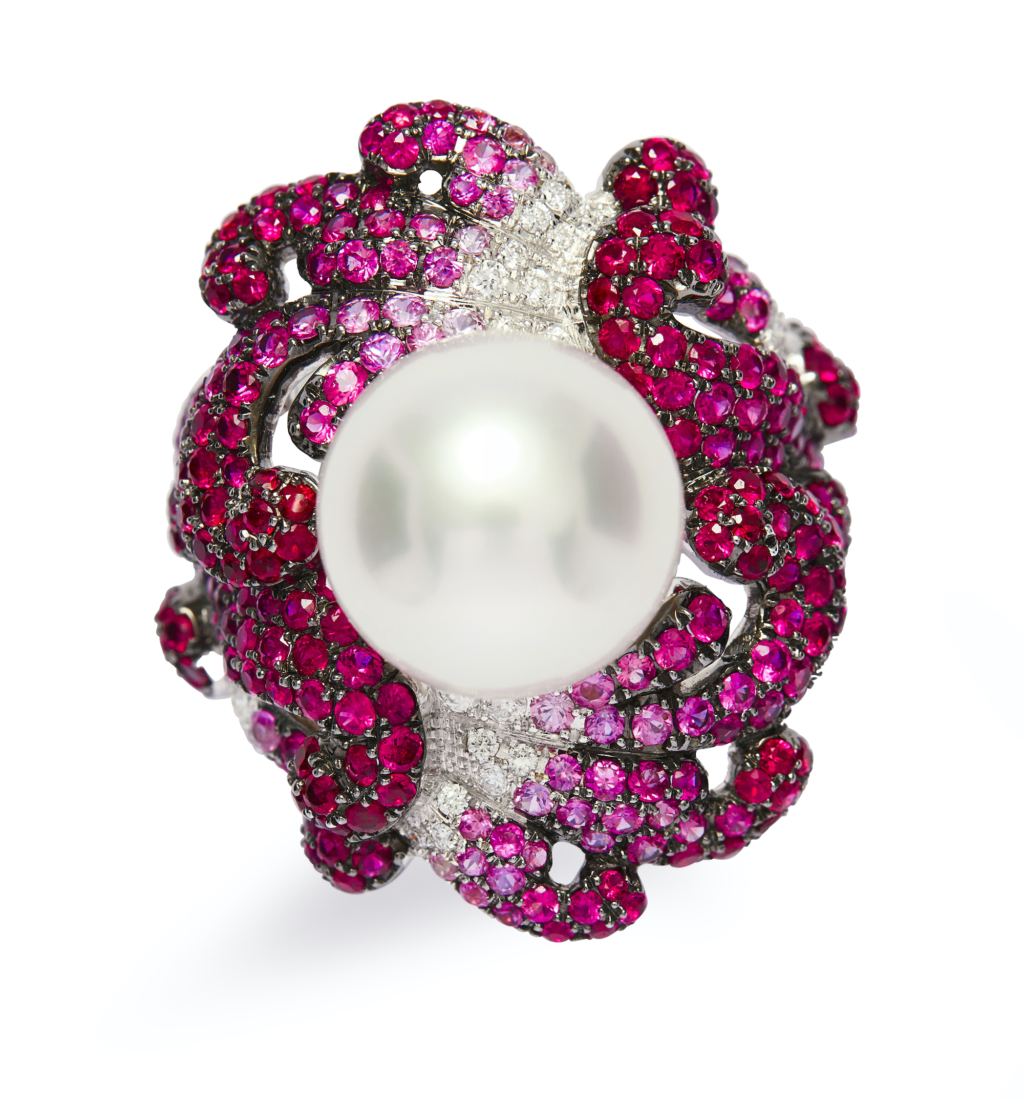 Centring a 11.00mm cultured pearl mounted above an openwork foliate surround decorated with circular-cut rubies, ruby pink sapphires and diamonds, the diamonds together stated to weigh 0.28 carat, size N, signed Autore.