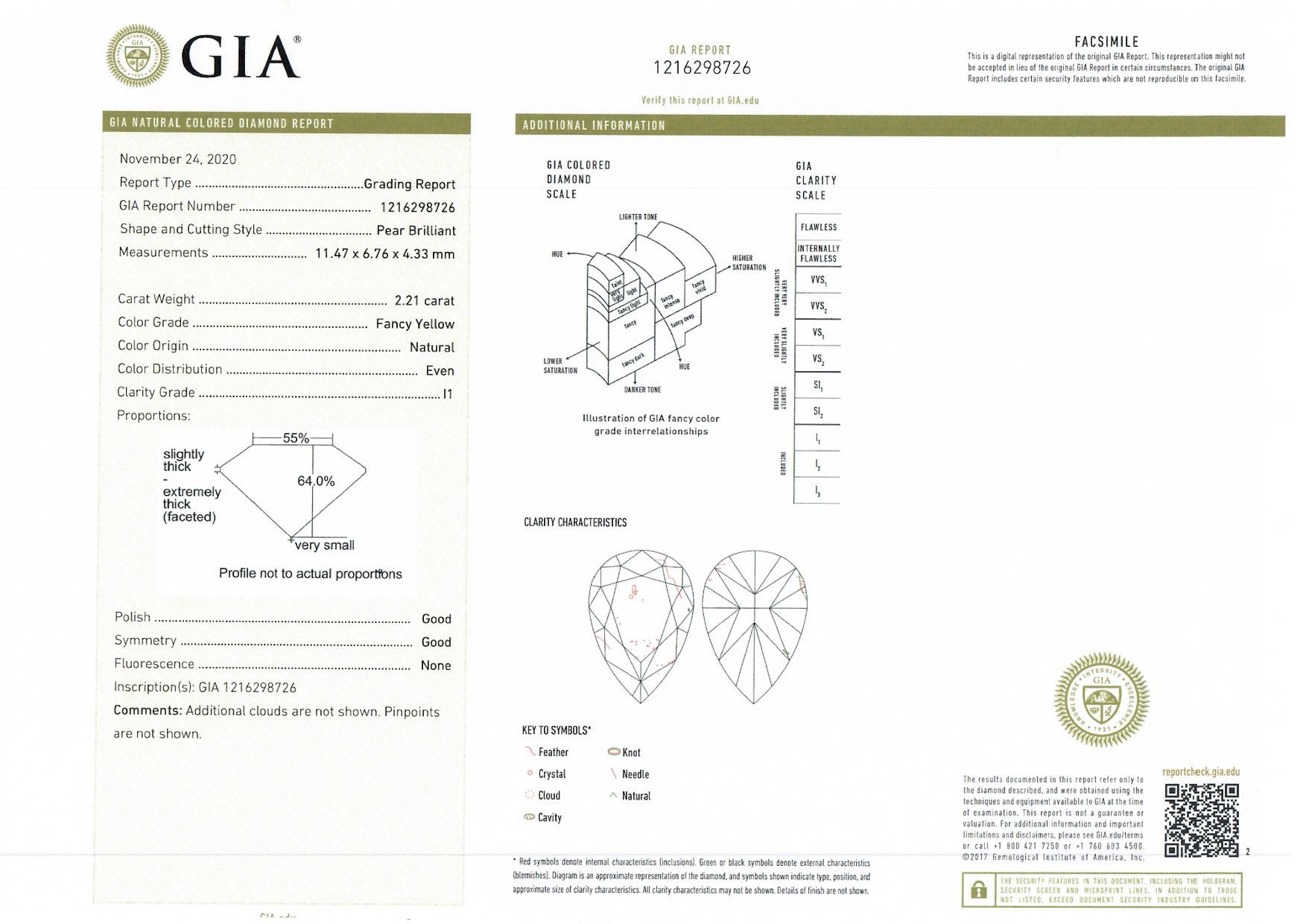a GIA report numbered 1216298726, dated 24 November 2020, stating that the 2.21 carat diamond is natural, fancy yellow colour, I1 clarity, laser inscribed;