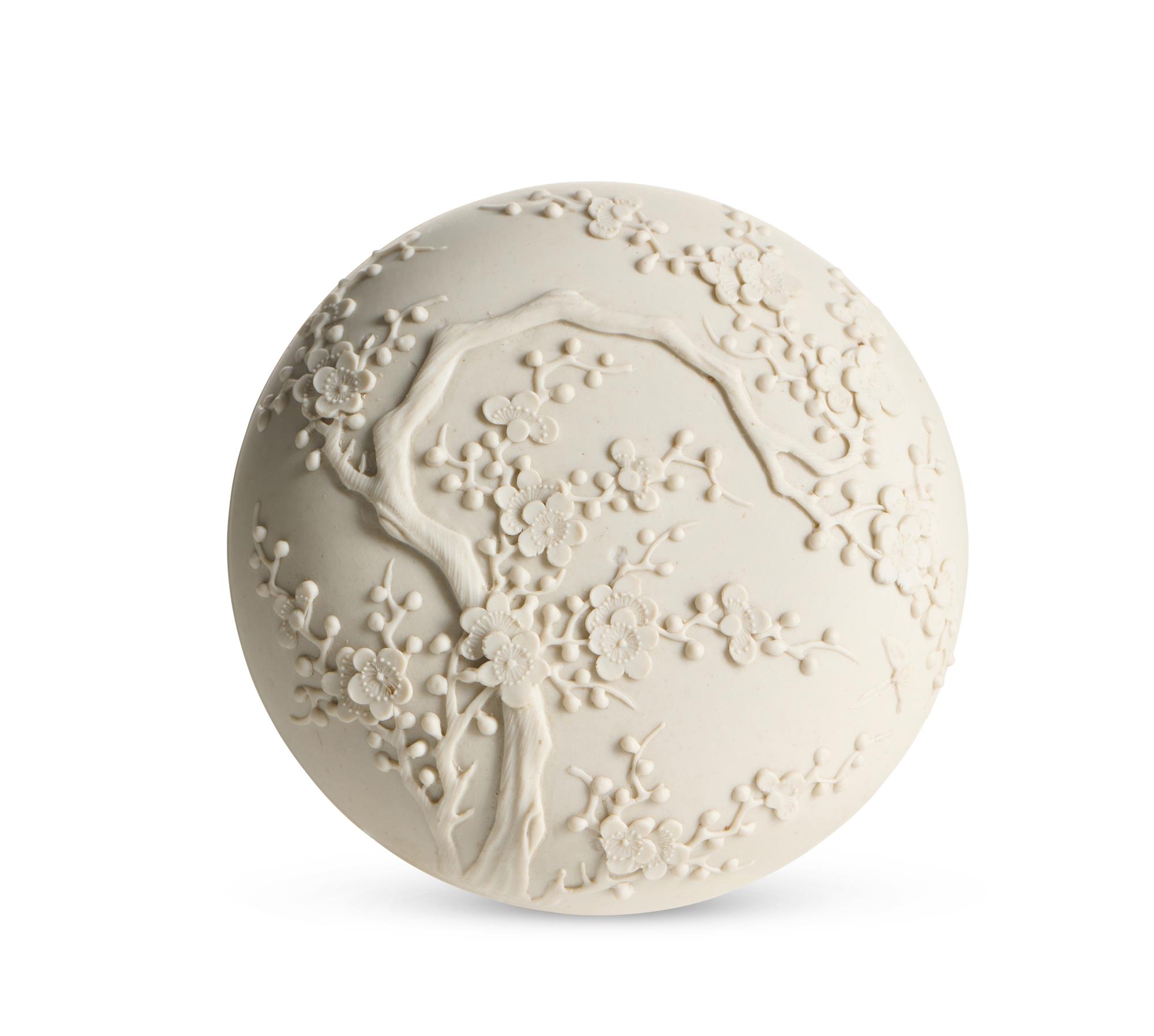 The two unglazed white biscuit wares comprising a compressed globular box and a bamboo form vase, both with carved applique decoration of plum blossoms and butterflies. Together with original receipt of purchase.
