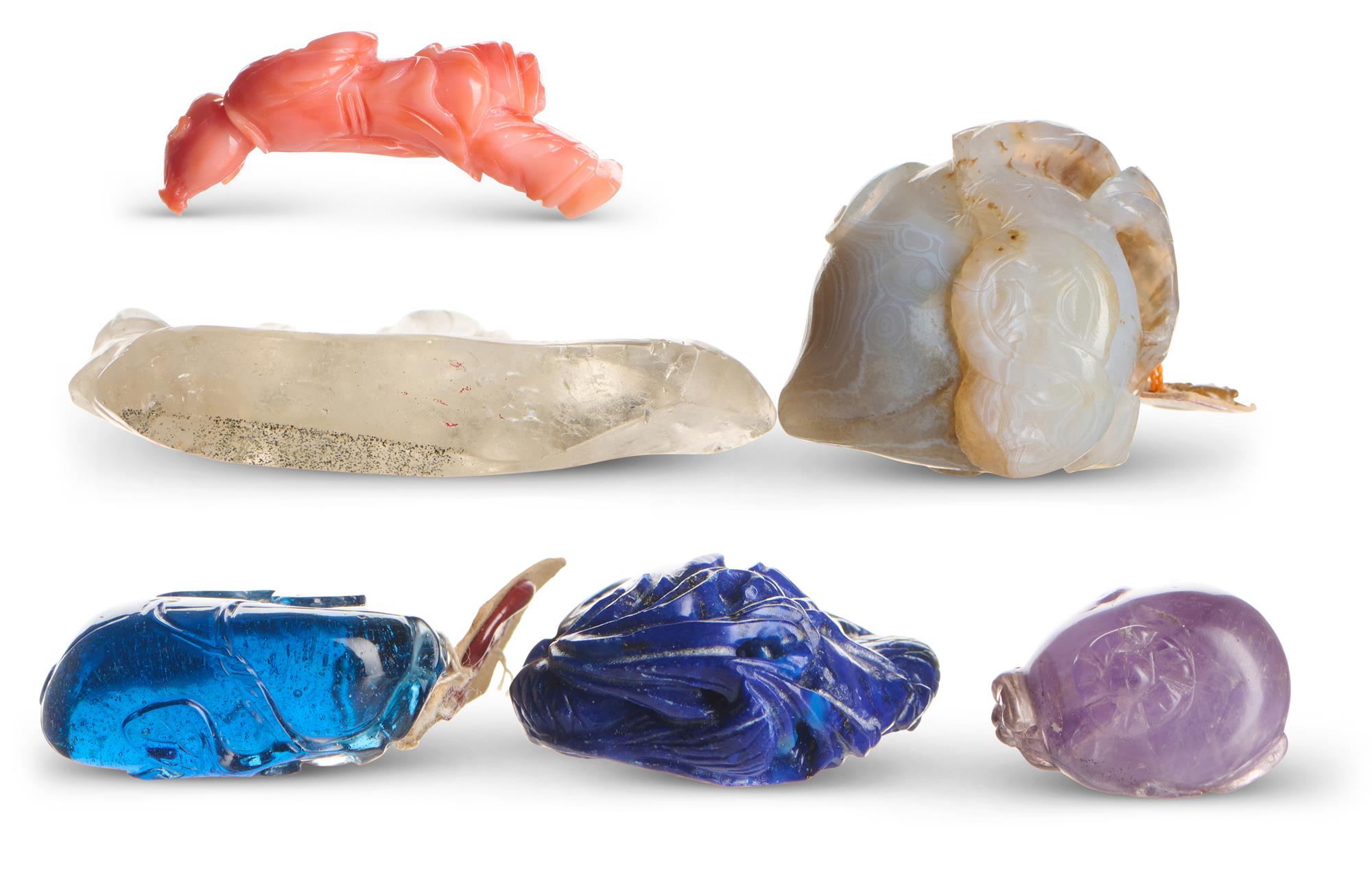Comprising: a five-mountain rock crystal brush rest; an agate peach; a lapis goldfish and lotus group; a blue Beijing glass gourd and vine pendant; an amethyst gourd and vine pendant; and a coral dancing male figure.