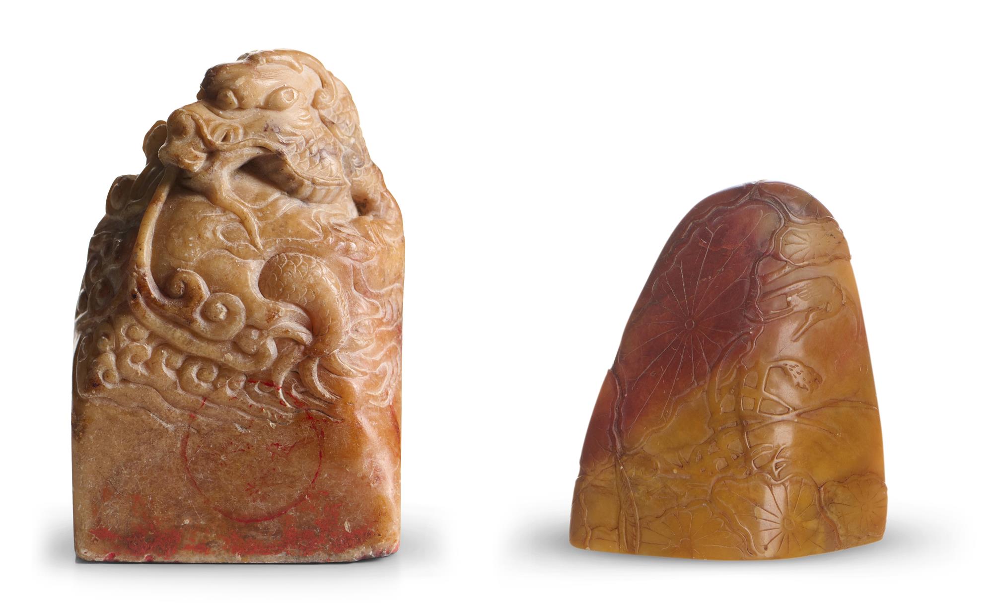 One seal of orange and yellow stone, in arched form, with low relief decoration of a lotus pond with herron swooping down, and a seven-character mark to base. The other seal of mottled pale brown stone, with relief carved decoration of a dragon, the base with a six-character mark. The dragon seal with a fitted old cloth covered box.