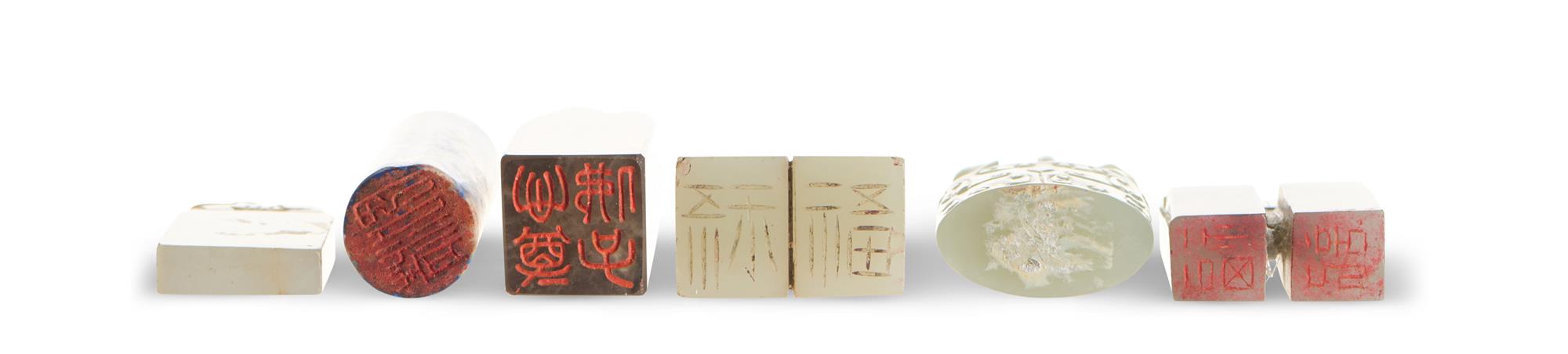 Comprising a smoky quartz seal in the form of a tall mountain with a four character mark to base; a cylindrical sodalite seal with two character mark to base; three pale celadon jade seals, one decorated with a qilong and archaistic clouds; and one double seal of grey jade with two characters to base.