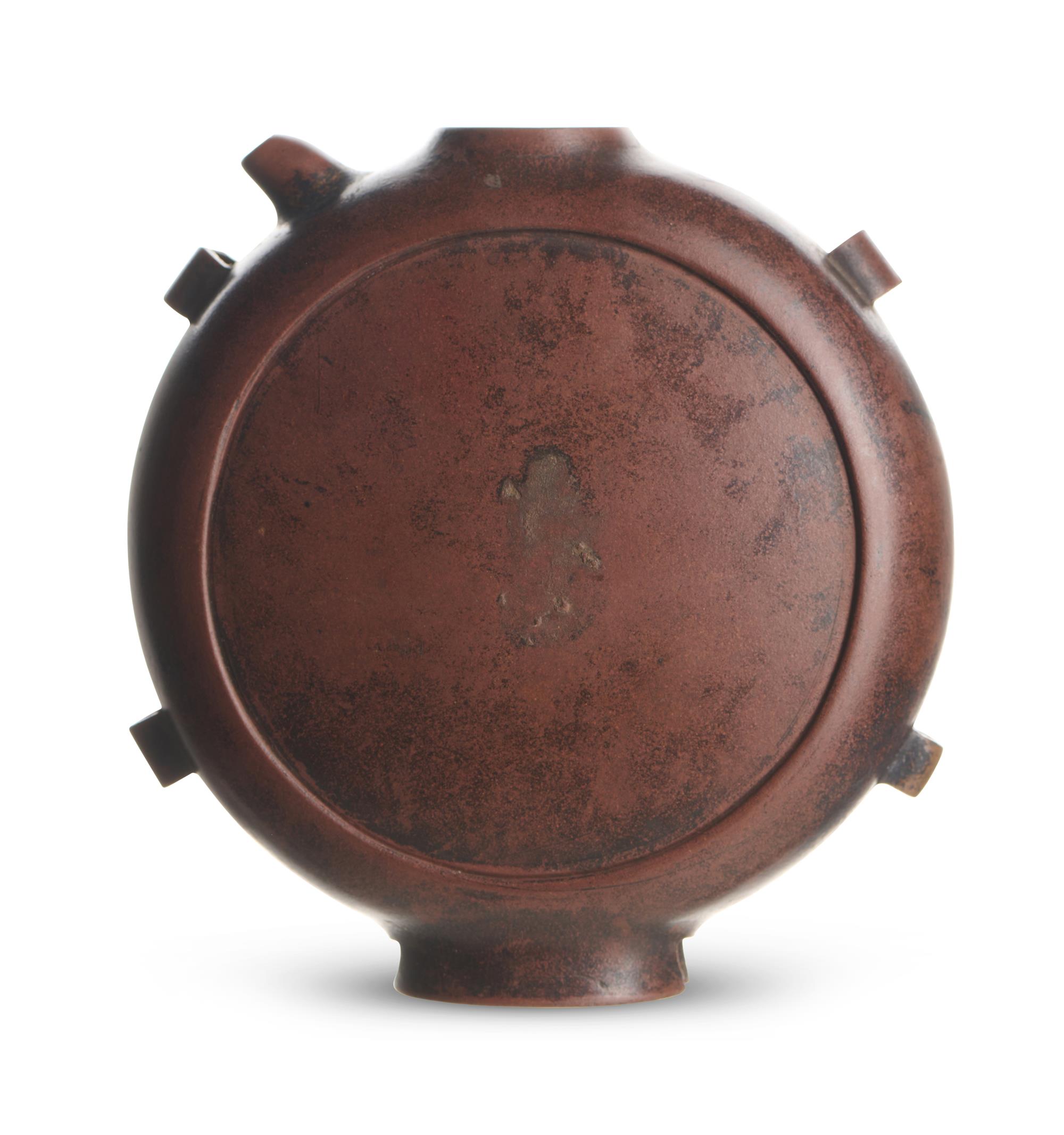 Of flattened spherical form, with lugs for a strap, and a spout to one side.