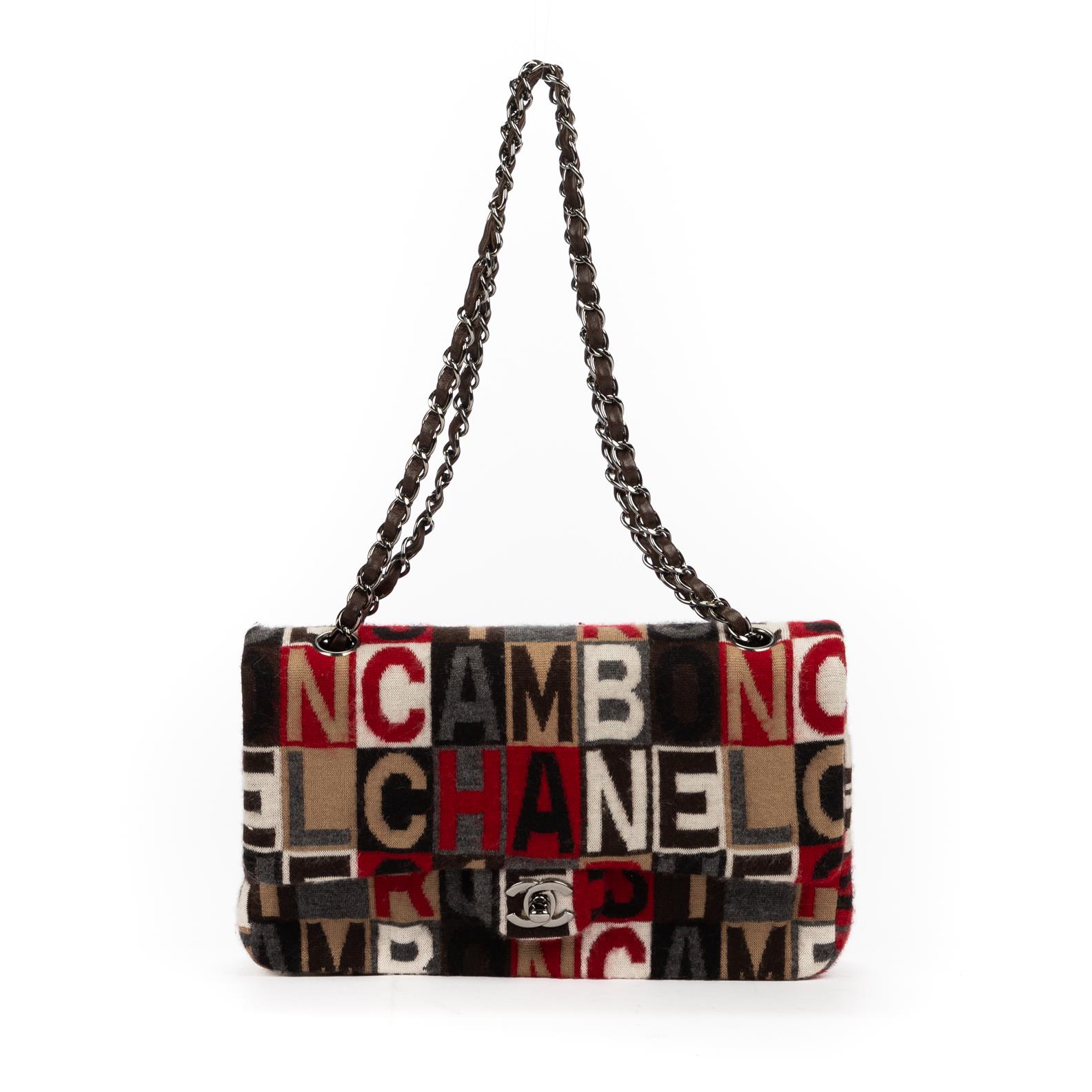 Styled in monogram jersey cotton with interlaced chain and brown leather strap and silver metal hardware, 27 x 16 x 6cm.