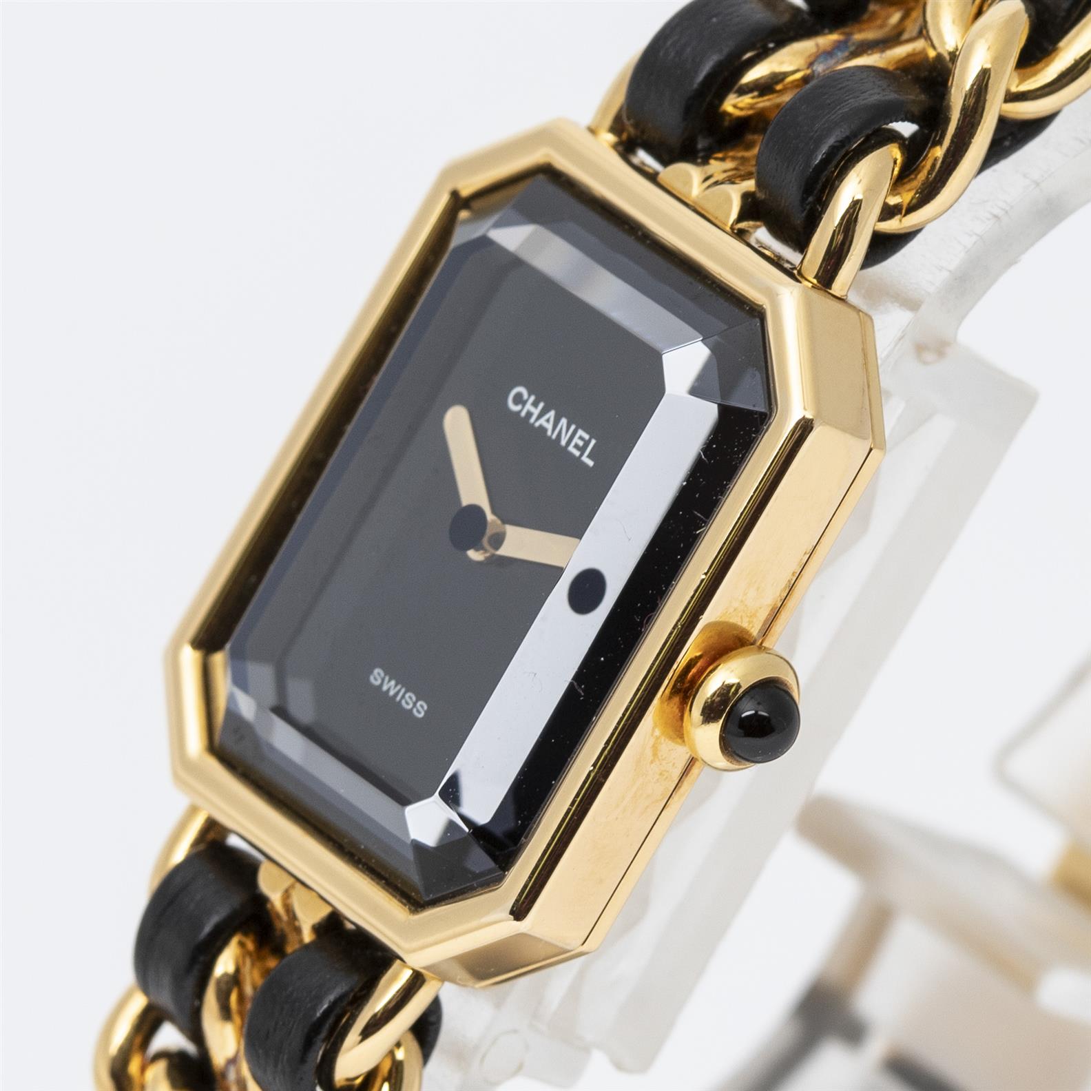 Quartz movement, rectangular black dial to a gold plated stainless steel case and conforming interlaced bracelet bands, total With interlaced stainless steal and leather bracelet, length 160mm, dial 20 x 25mm, reference number QR16228.