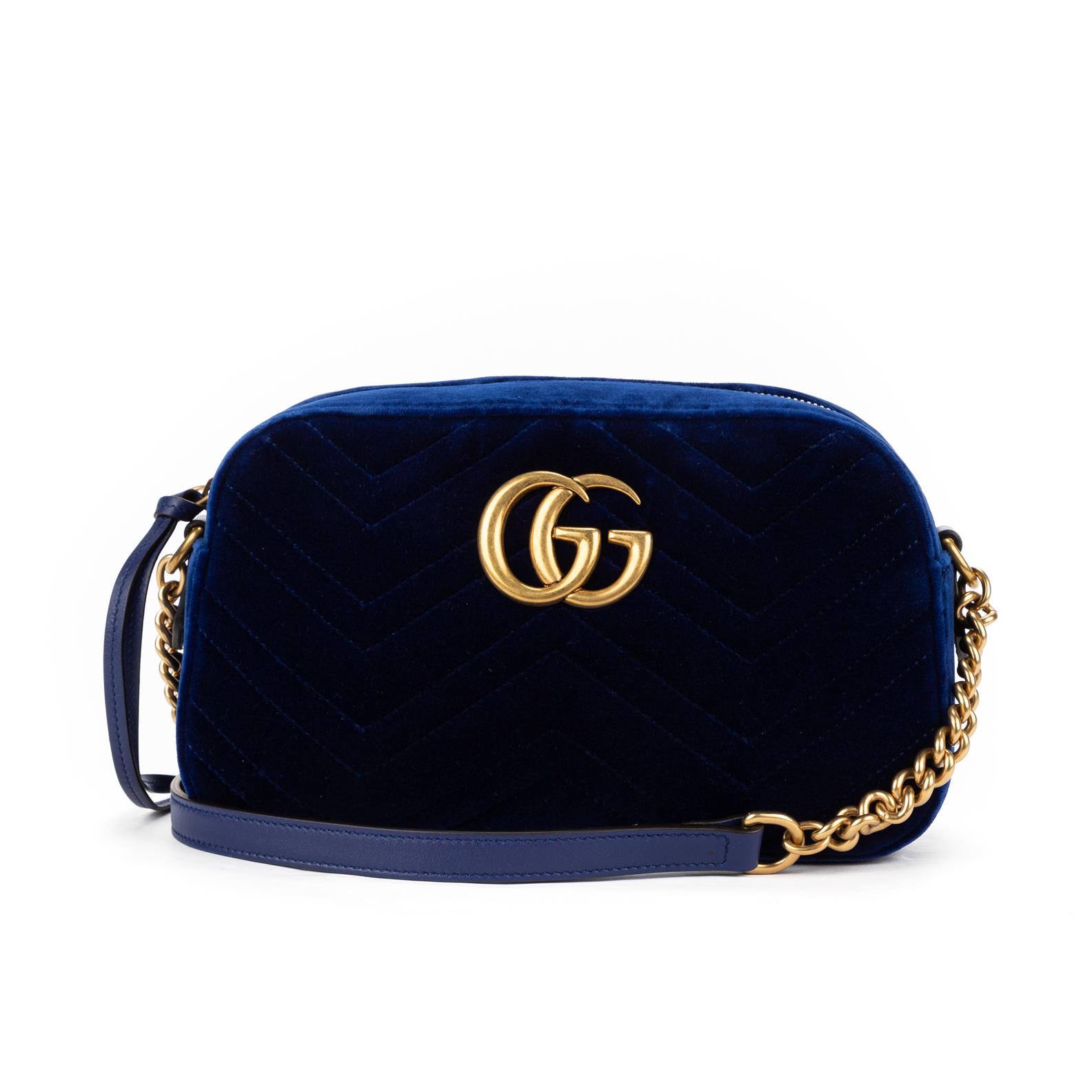 Styled in navy blue velvet with leather and chain strap and gold tone hardware, 24 x 15 x 8 cm.