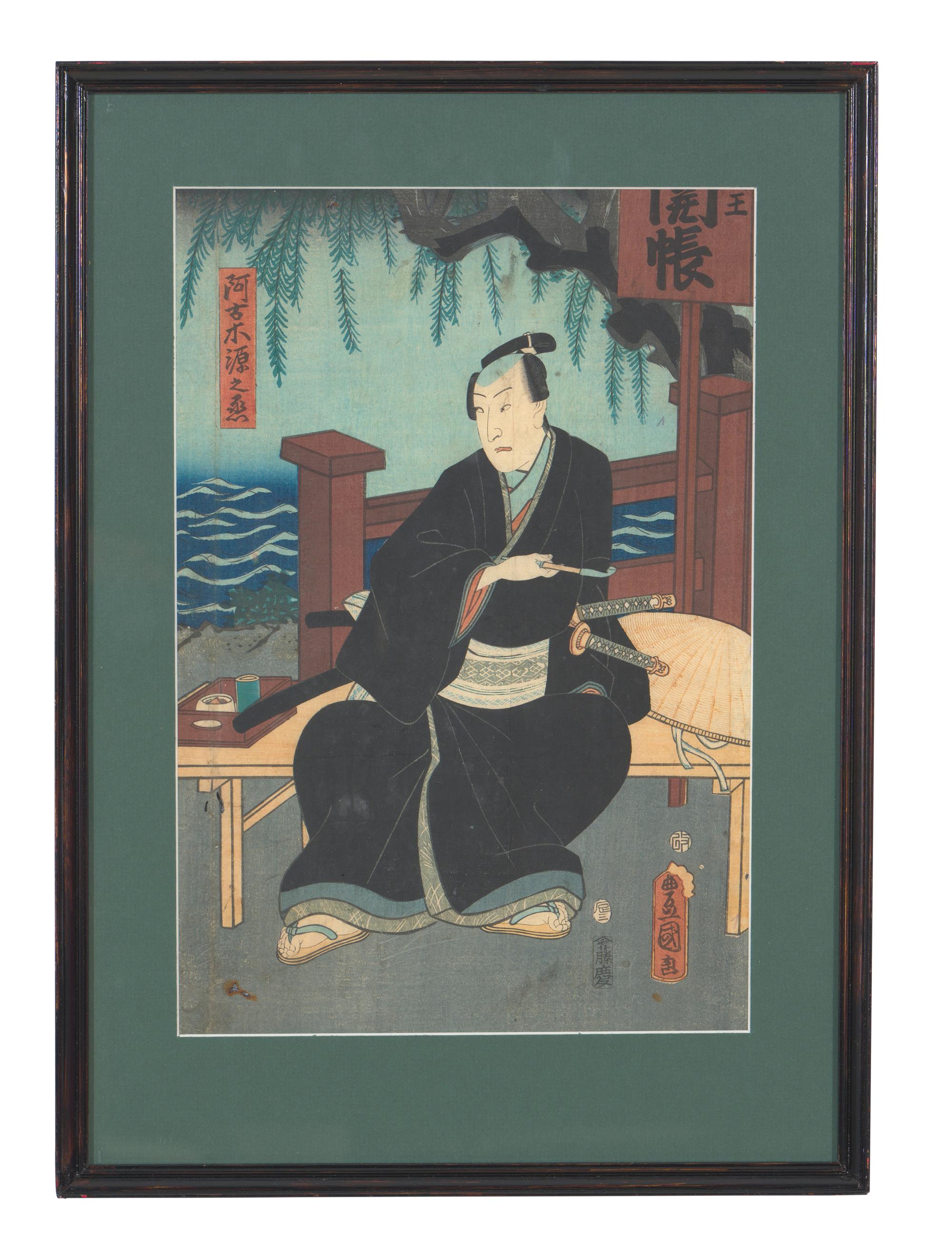 The first a male samurai figure taking rest by the side of the river, signed Toyokuni ga.