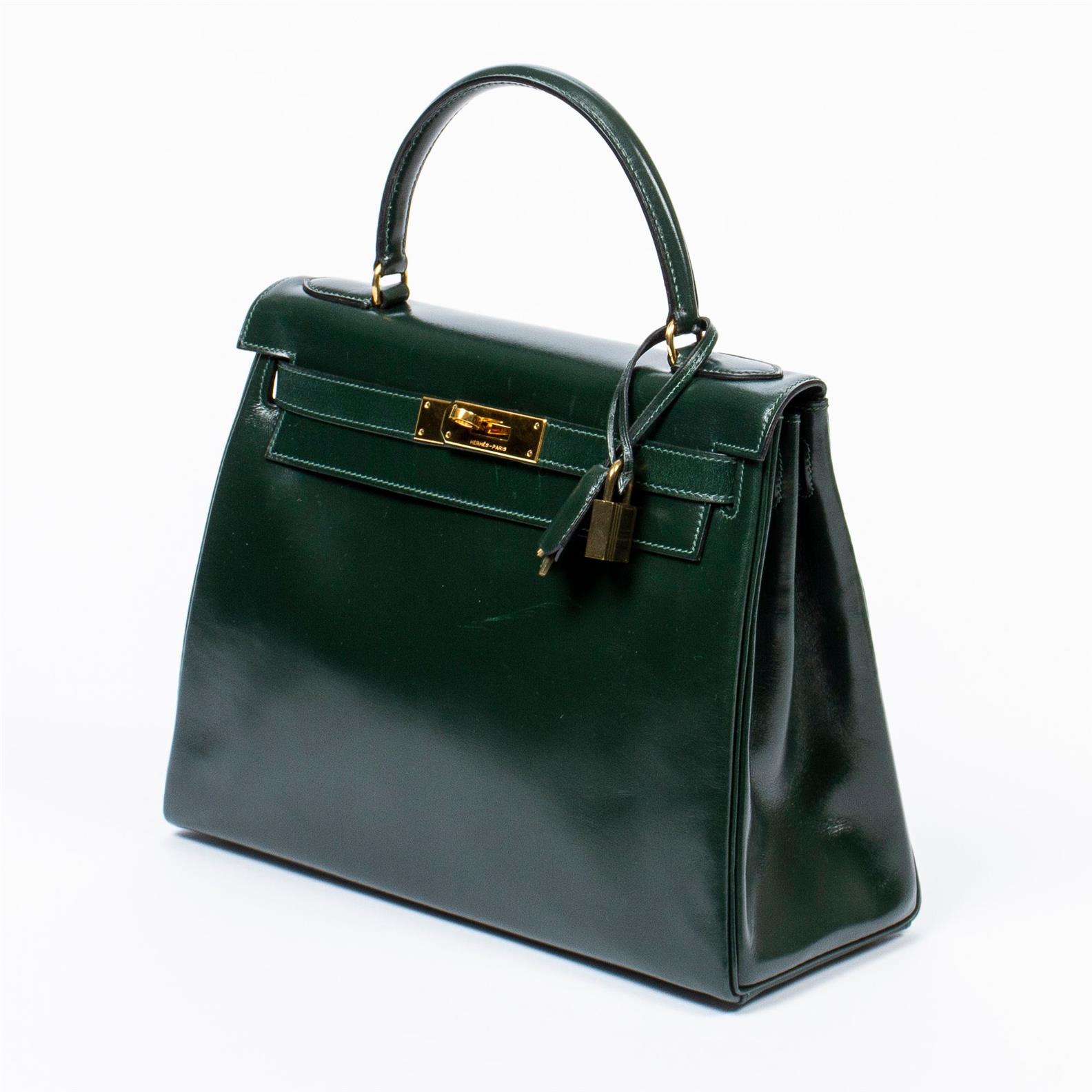 Styled in dark green box leather and gold tone hardware, 28 x 22 x 11cm.