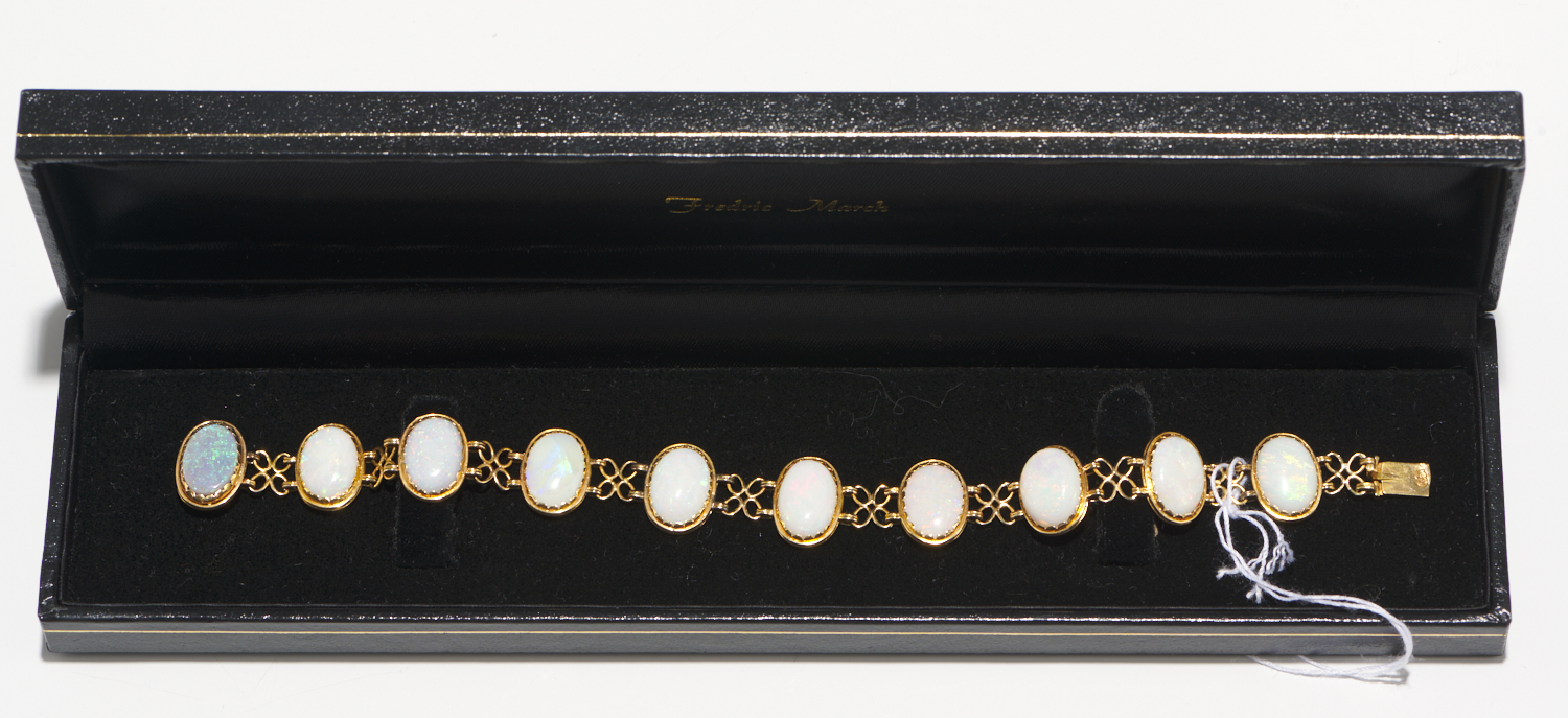 AN OPAL BRACELET IN 14CT GOLD, BOXED