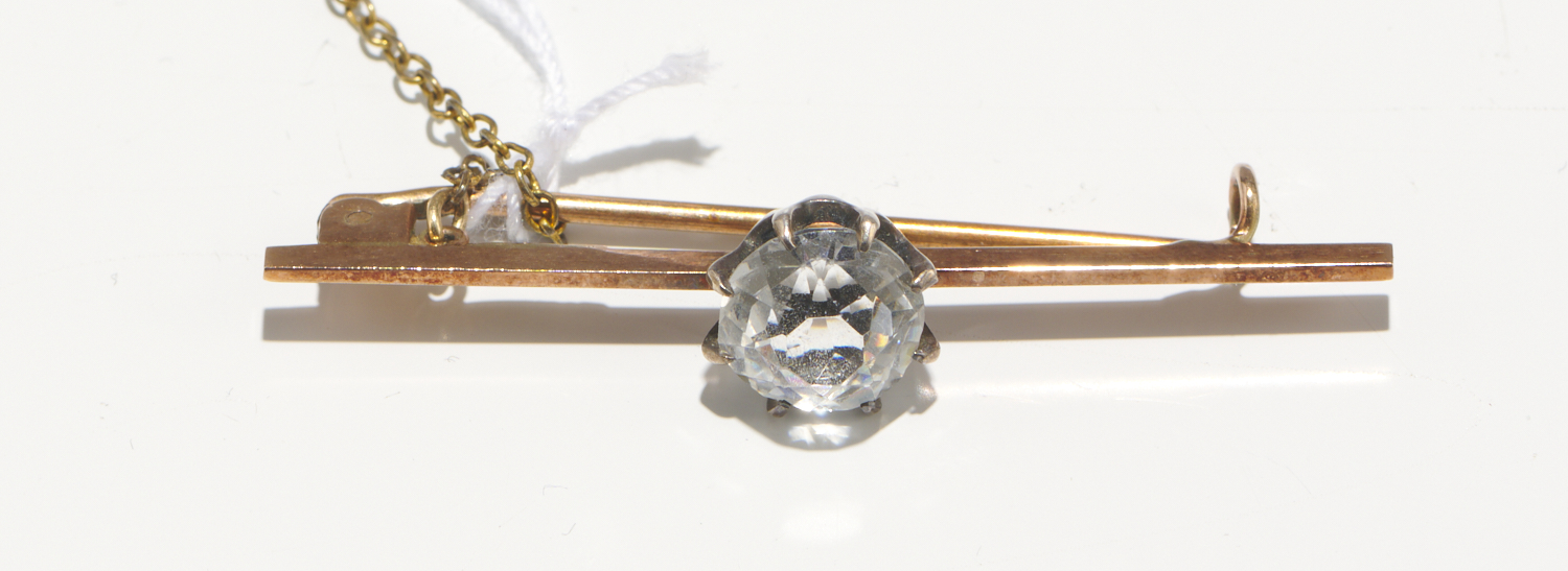 A TOPAZ SET BAR BROOCH IN 15CT GOLD AND SILVER