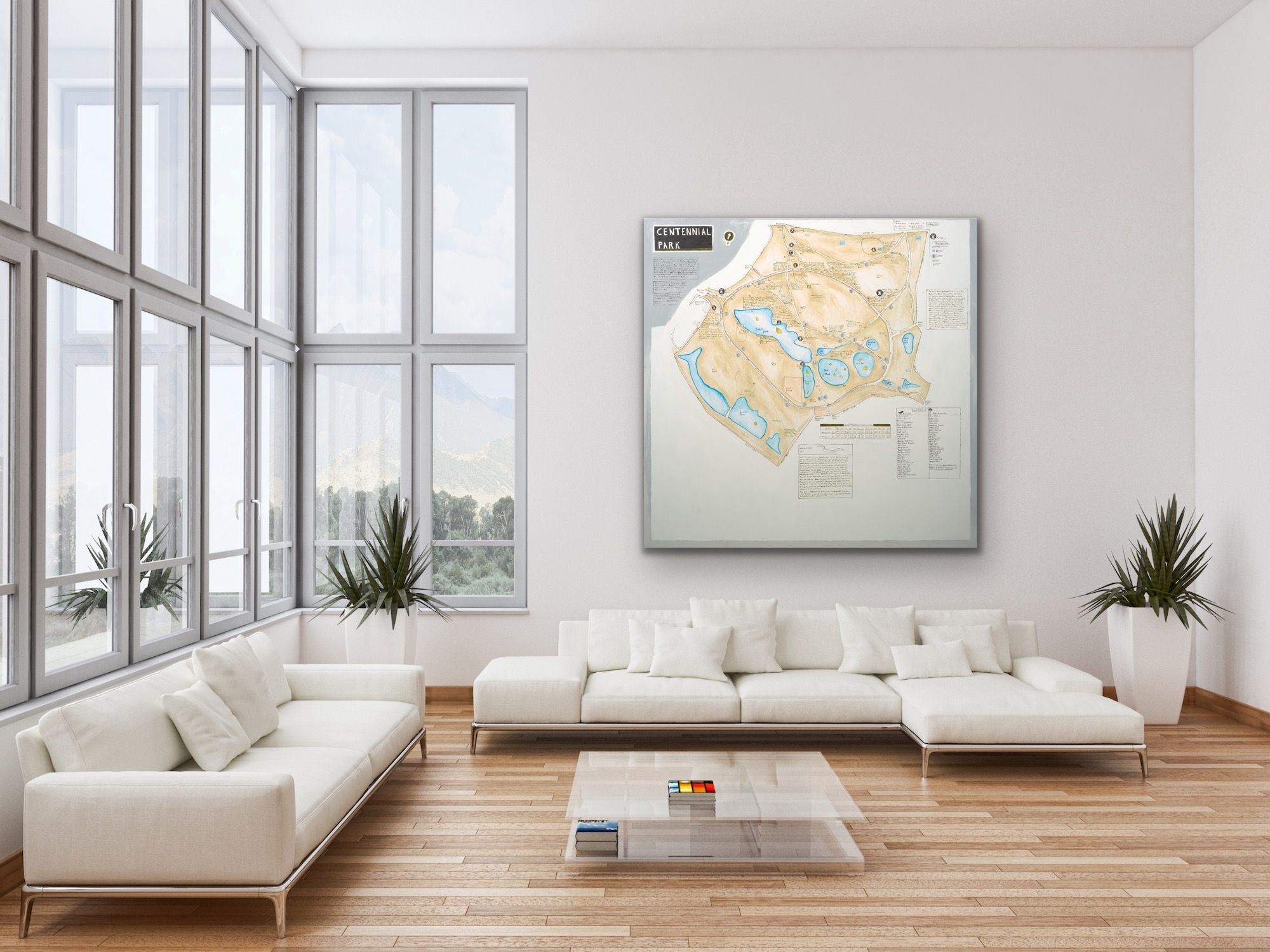 Across a span of 15 years, Noel produced his map series. These works take Australia as the central story combining dialogues of nationhood and place. With his always witty approach, Noel addresses the redundancy of traditional maps, now replaced with GPS systems and digital diagrams. His map works are informative, although selectively so. When examining Centennial Park we can see Noel's notes on vicious crimes and murders that have taken place across the park, the acknowledgement of displacement of the traditional Indigenous land, and Noel's own personal anecdotes including where his son received the Cross Country title in 2010.