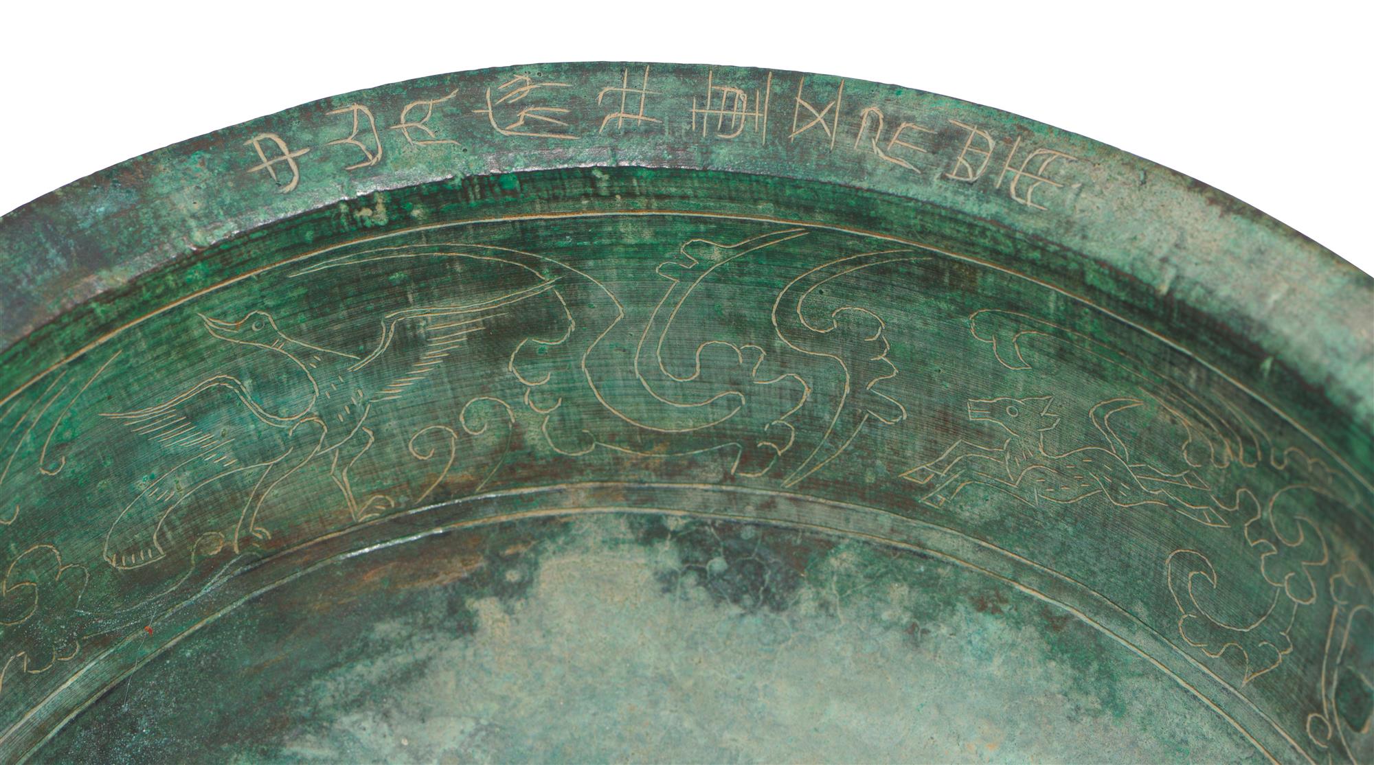 Decorated with incised decoration around the cavetto of birds and beasts surrounded by scrolling foliage, two taotie mask and ring handles, and an archaic inscription to the rim, the whole covered in a beautiful verdigris patina.