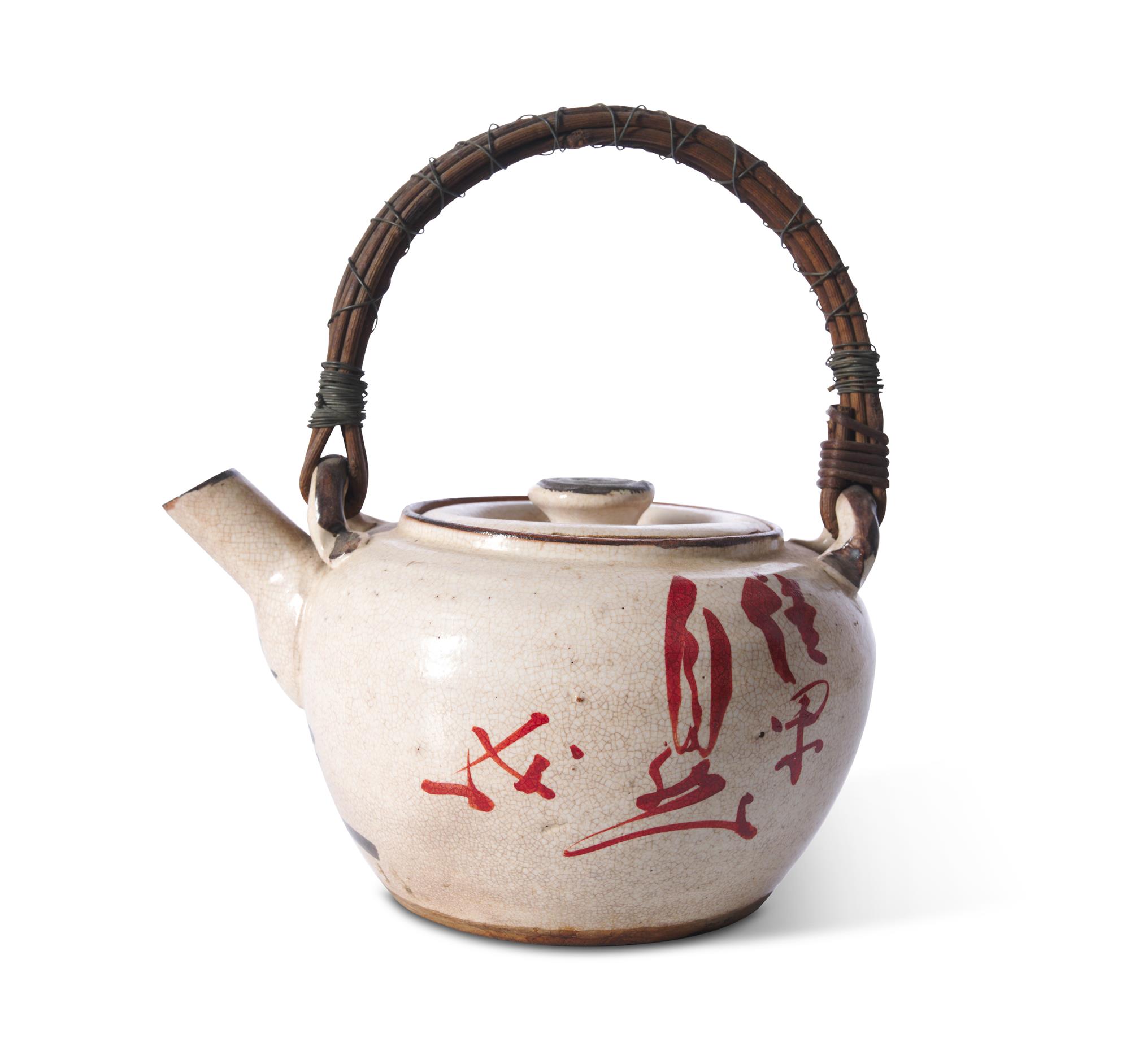 The large stoneware teapot with overhead cane handle decorated in orin red and brown with Daruma to one side and an inscription to the reverse.