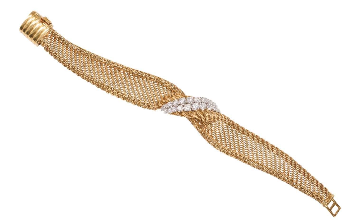 The flexible mesh link design culminating at the centre with a curved scrolling tie set with a double row of brilliant-cut diamonds together weighing approximately 2.50 carats, signed Kutchinsky, and with maker's mark 'Kld' for Kutchinsky, hallmarked London, 1970, length 182mm.
