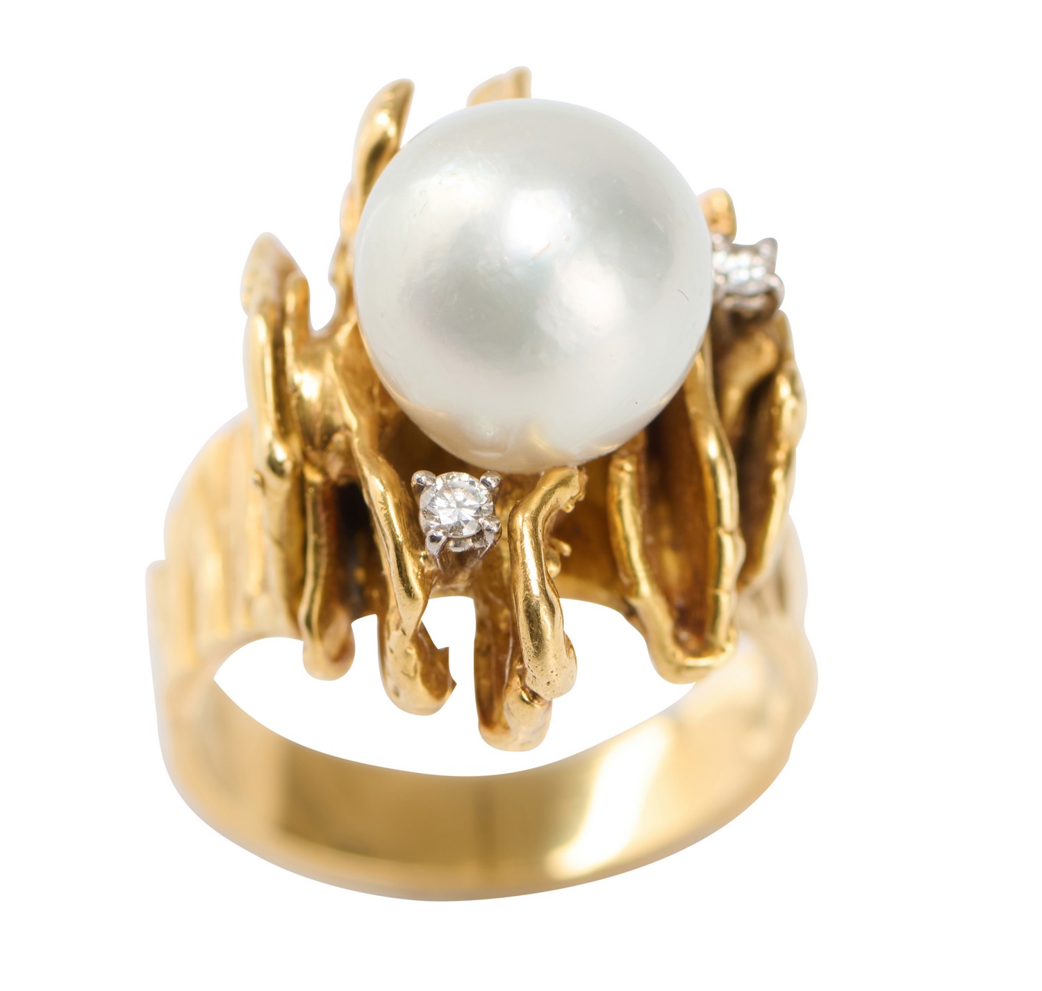 Centring a near round pearl of white hues measuring approximately 11.3mm, within a sculptural surround detailed with two round brilliant-cut diamonds, ring size R.
