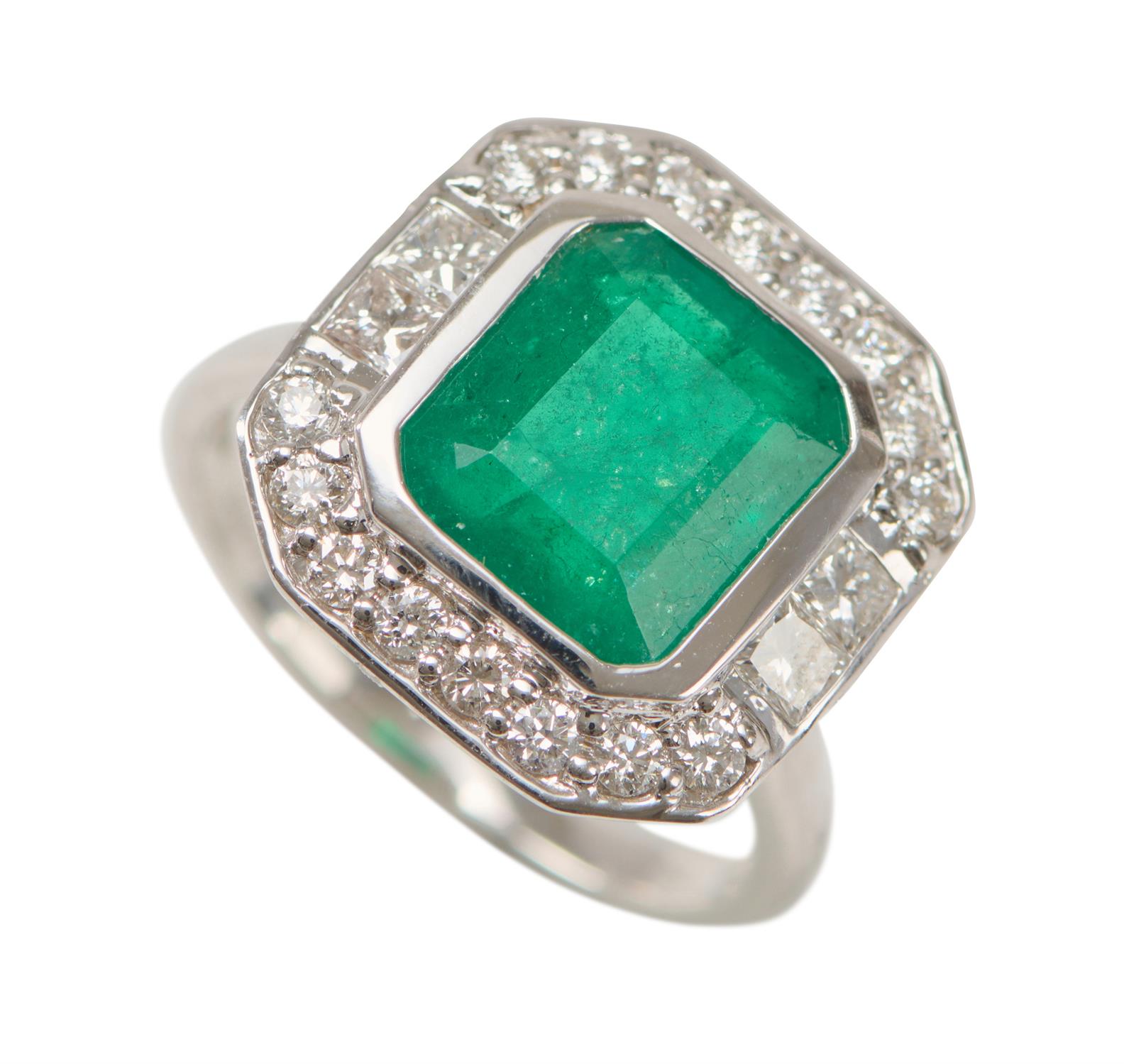 Centring an emerald-cut emerald weighing 2.99 carats, within an octagonal border of round brilliant and princess-cut diamonds, size P.