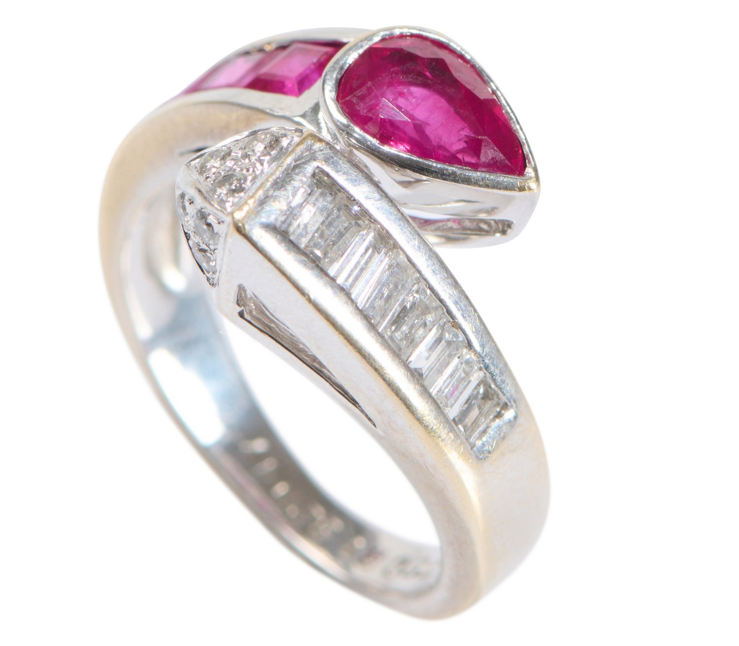 Of retro crossover design, composed of square baguette and pear-cut rubies together weighing 1.32 carats, and tapered baguette and round brilliant-cut diamonds together weighing 0.47 carats, ring size K.