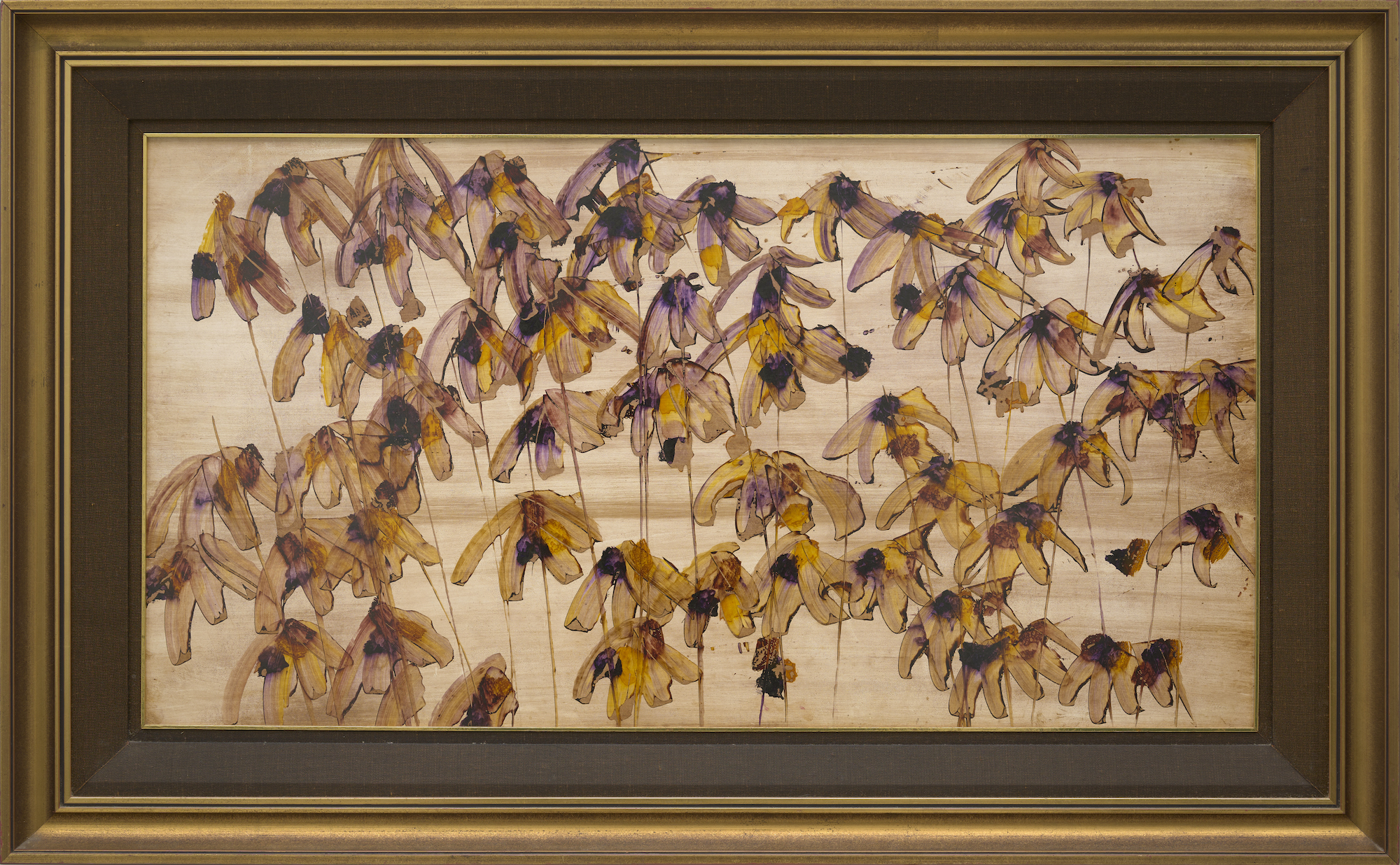 It appears a chemical reaction has occurred on certain pigments on this work. This may appear initially to be paint loss but upon close inspection is consistent across the whole work and related to the medium used by the artist, therefore entirely inherent to the work. Framed size: 82 x 131cm