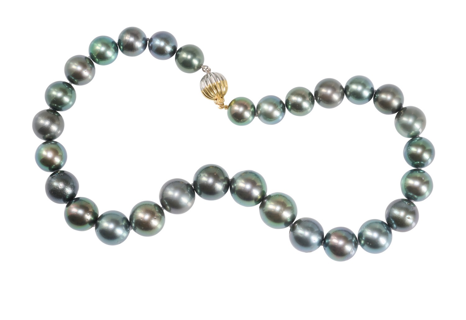 Composed of twenty-nine graduating round pearls of green and grey hues measuring 12.10mm-15mm, completed by a two-tone 18ct gold ball clasp, length 410mm.