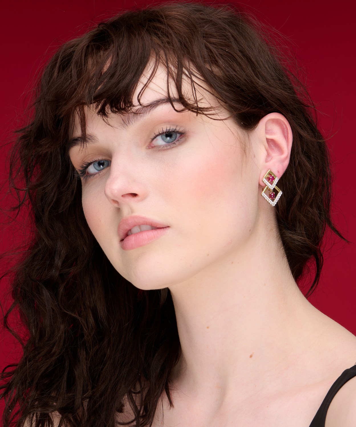 A PAIR OF RUBY AND DIAMOND EARRINGS IN TWO TONE 14CT GOLD, EACH EARRING COMPOSED OF TWO OVERLAPPING OPEN DIAMOND SHAPED DROPS, EACH CENTRING A CABOCHON RUBY TOGETHER WEIGHING APPROXIMATELY 1.24 CARATS AND DETAILED WITH ROUND BRILLIANT-CUT DIAMONDS TOGETHER WEIGHING APPROXIMATELY 0.50 CARATS, TO POST AND CLIP FITTINGS, LENGTH 30MM