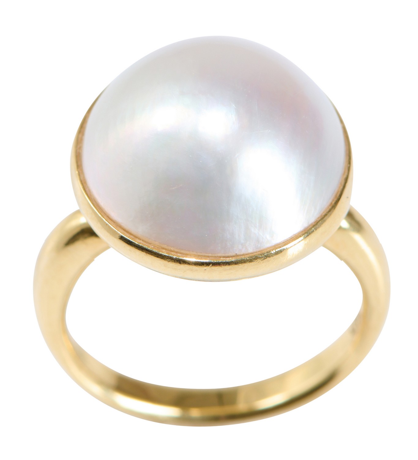 Centring a mabe pearl of silver white hues measuring 15.00mm, signed P for Paspaley, ring size M.