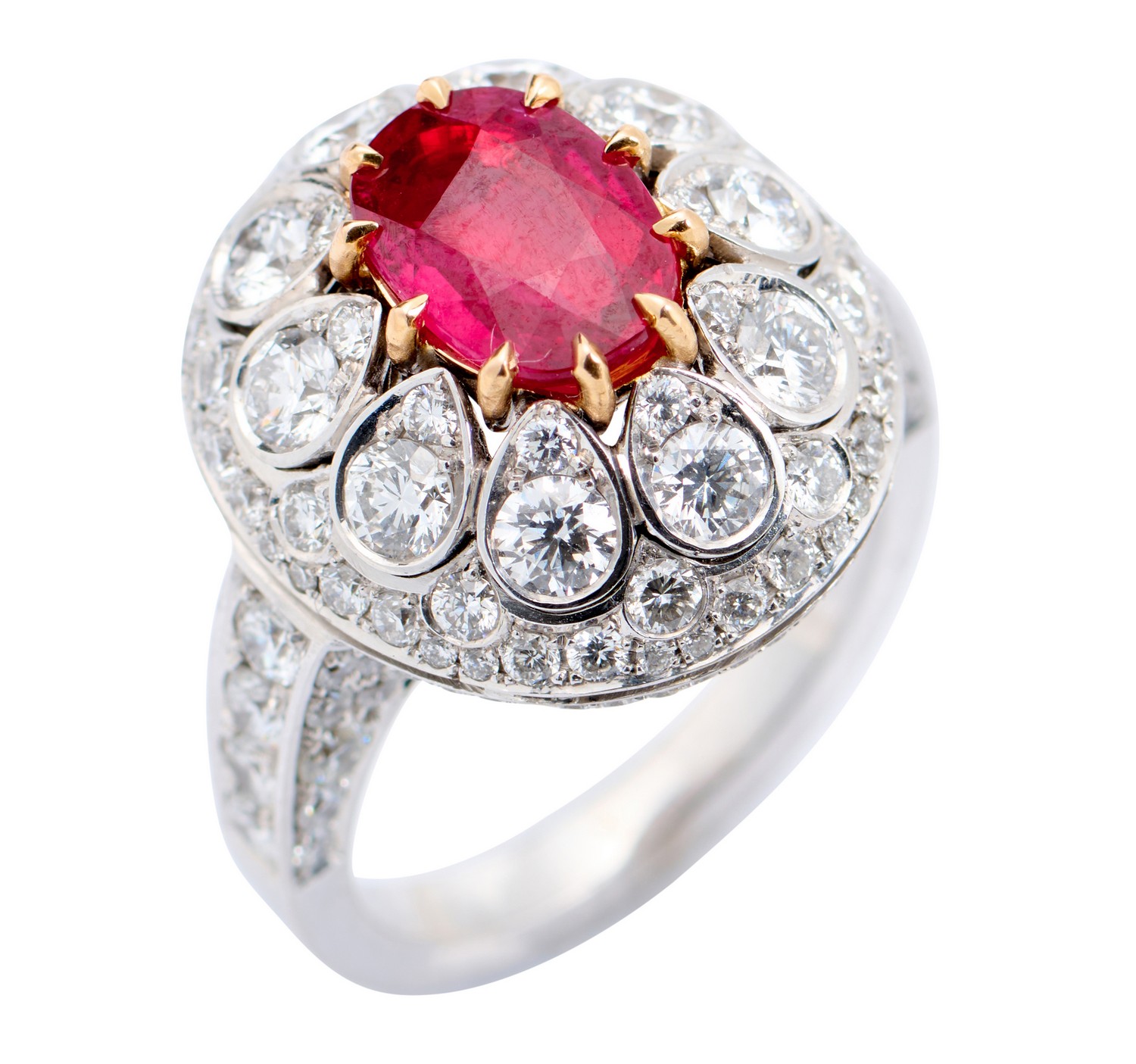 The domed plaque, centring a claw-set oval-cut ruby weighing 2.09 carats, within a surround of ten round brilliant-cut diamonds and pavé-set diamonds together weighing approximately 2.88 carats, ring size M.