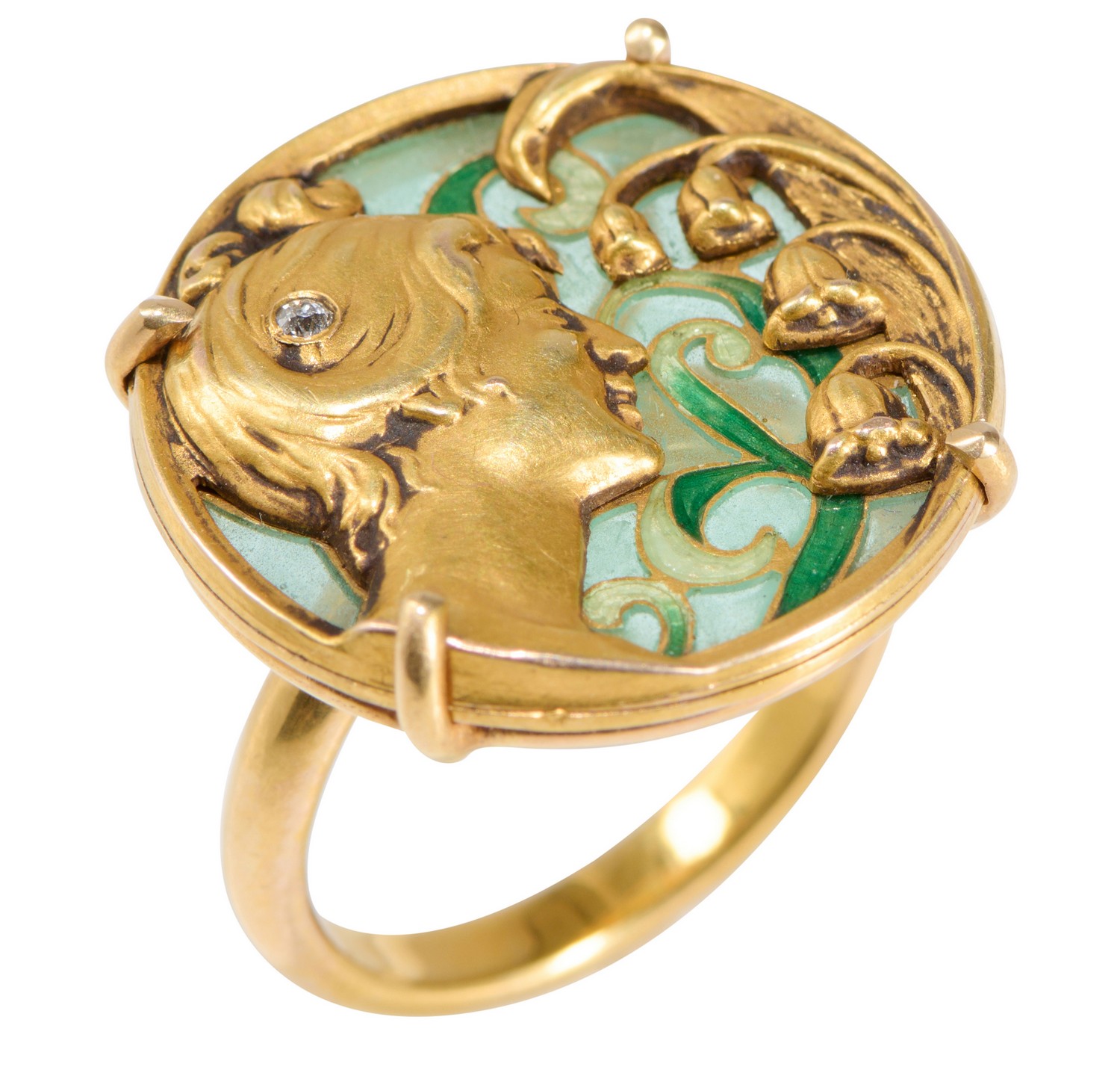 The circular plique-a-jour plaque, with a gold overlay depicting the profile of a woman and lily-of-the-valley flowers, detailed with an old European-cut diamond detail, ring size L.