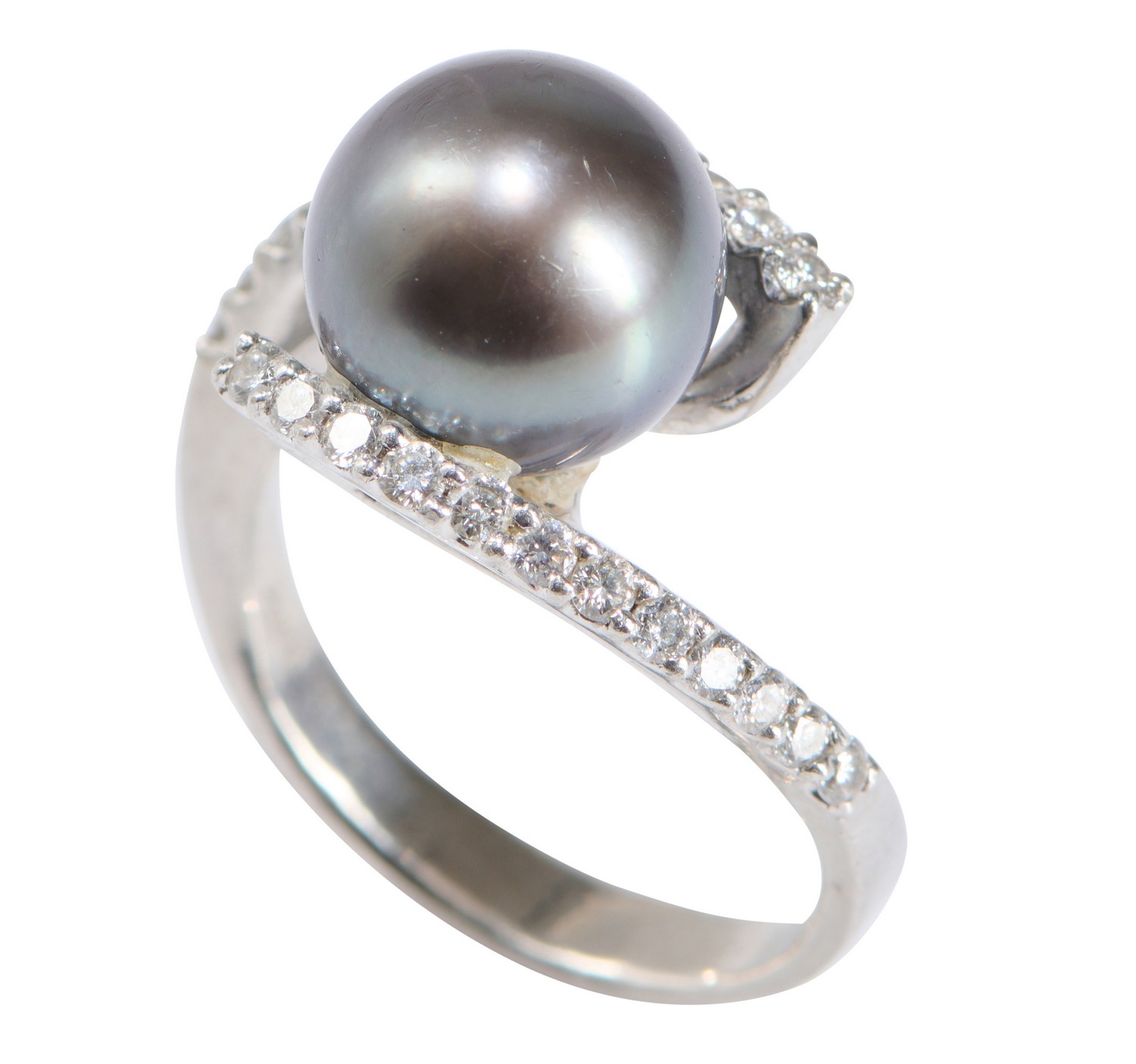 Of crossover design, centring a round pearl of grey hues measuring 10.30mm, between round brilliant-cut diamond set shoulders together weighing approximately 0.35 carats, ring size O.