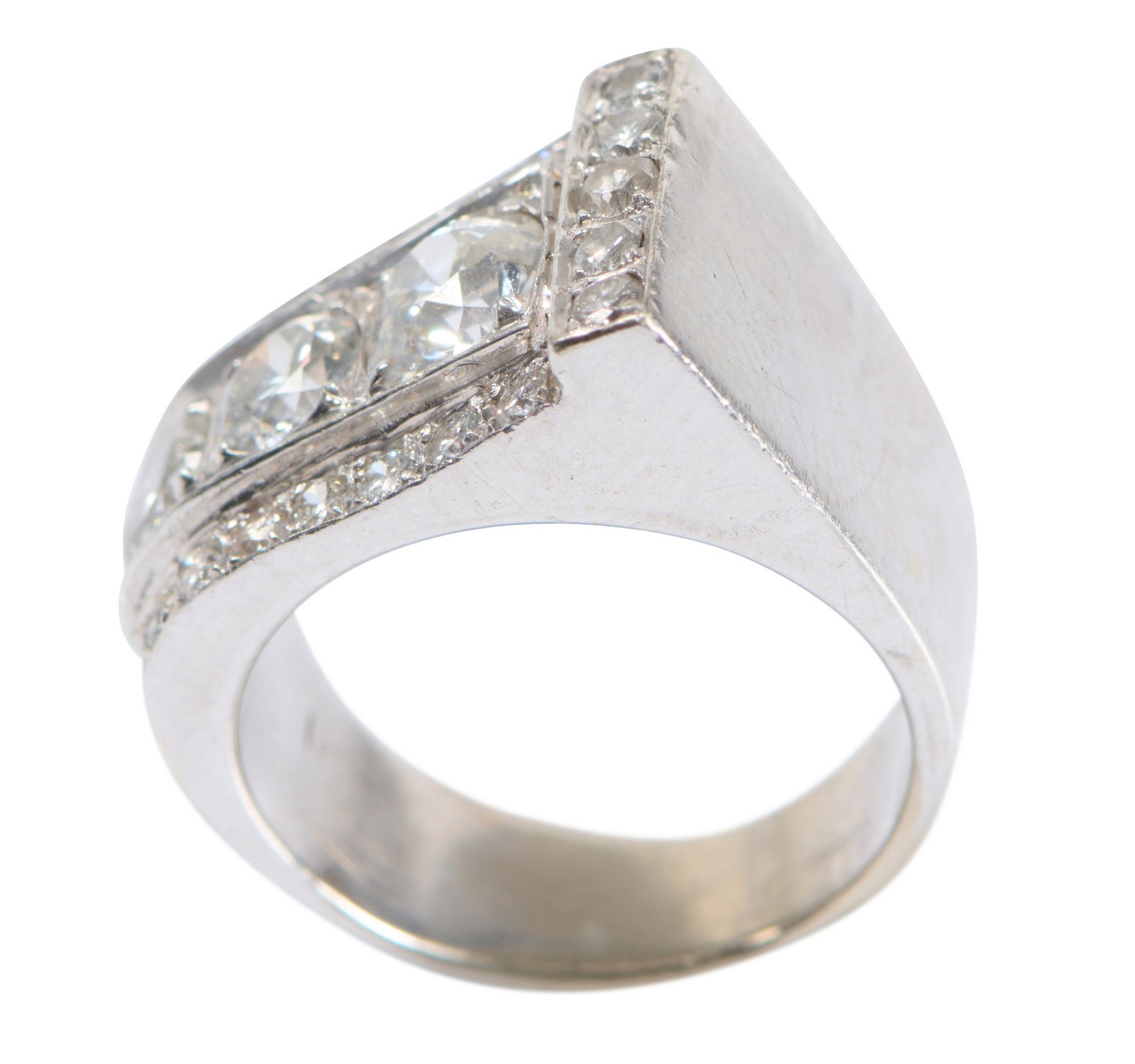 Diamonds approximately J-K colour, VS clarity as gauged and graded in the mount, tiny chips to girdles of some stones