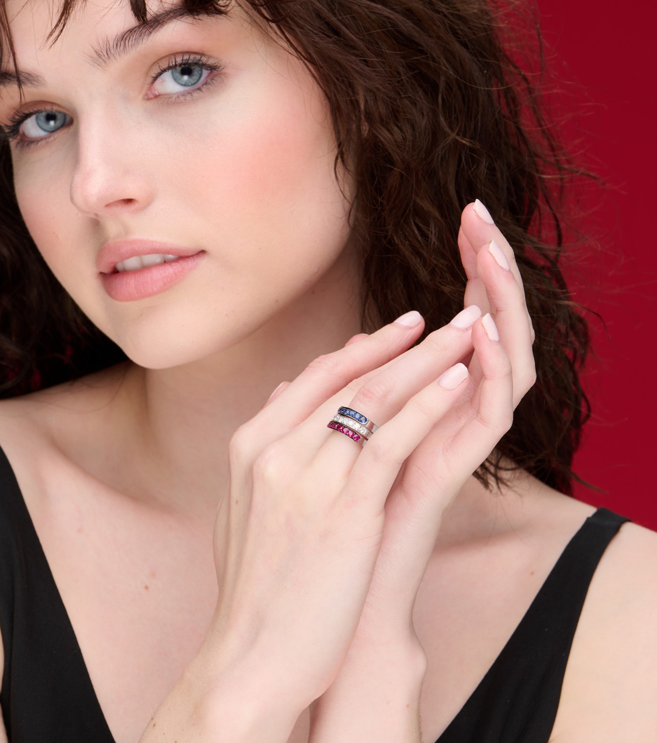 Each stackable ring set with fifteen circular-cut rubies, sapphires and diamonds respectively, each weighing approximately 0.75 carats, French marks, ring size I.