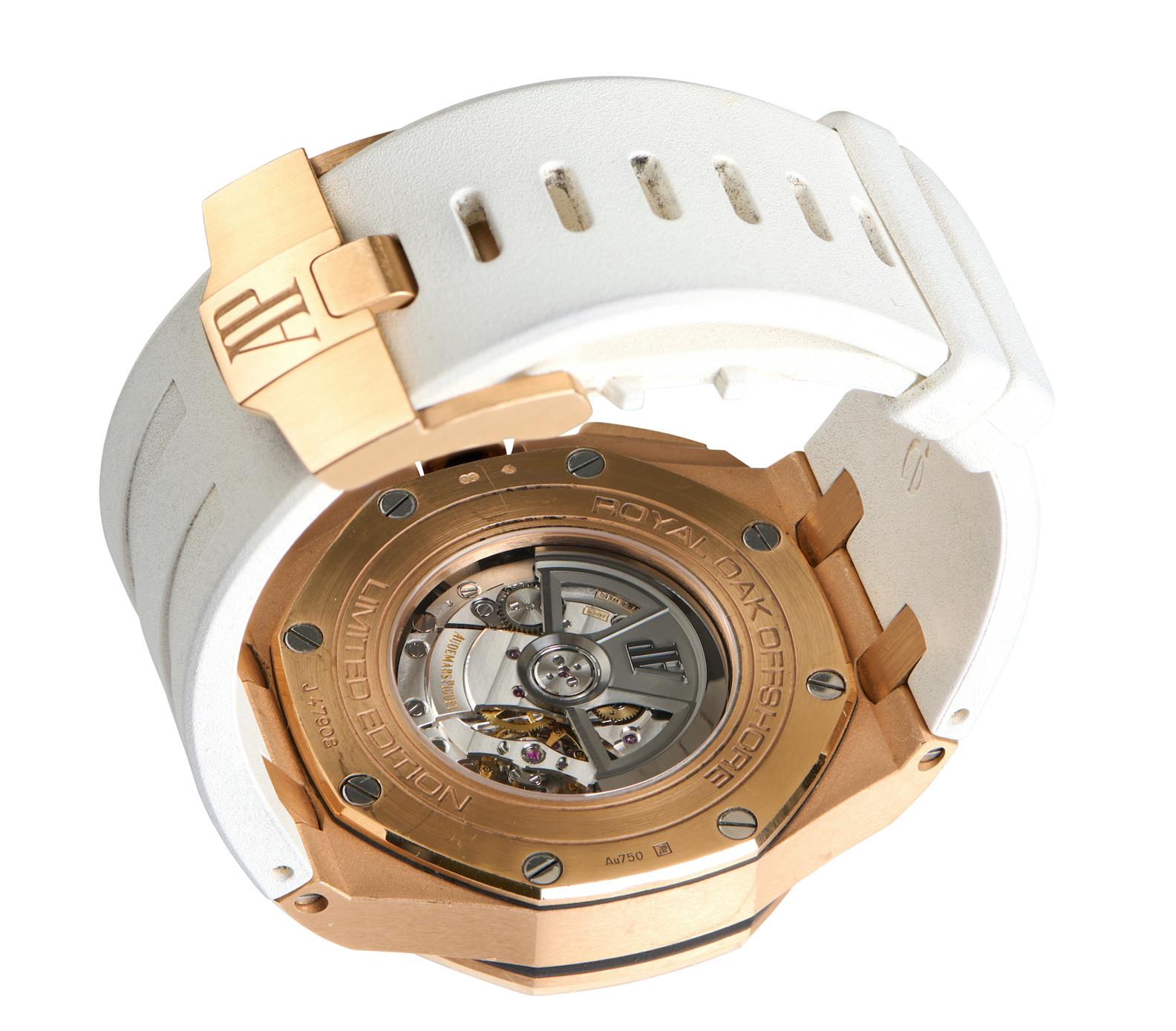 Closure: Audemars Piguet fitted white rubber tropical strap and AP 18ct pink gold buckle