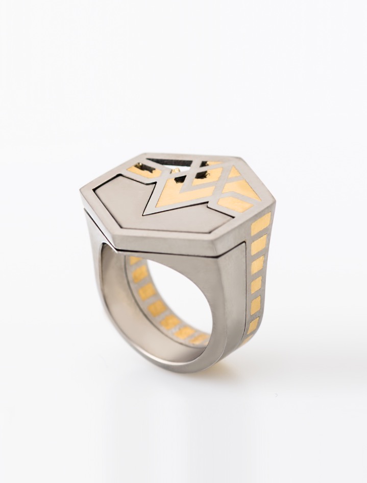 A 3D PRINTED TWO PART TITANIUM RING WITH 9CT YELLOW GOLD INSERTS BY CARL NOONAN, RETAILED BY E.G.ETAL, SIZE Q, 16.41GMS, BOXED WITH DESIGNER BLURB PAPERS