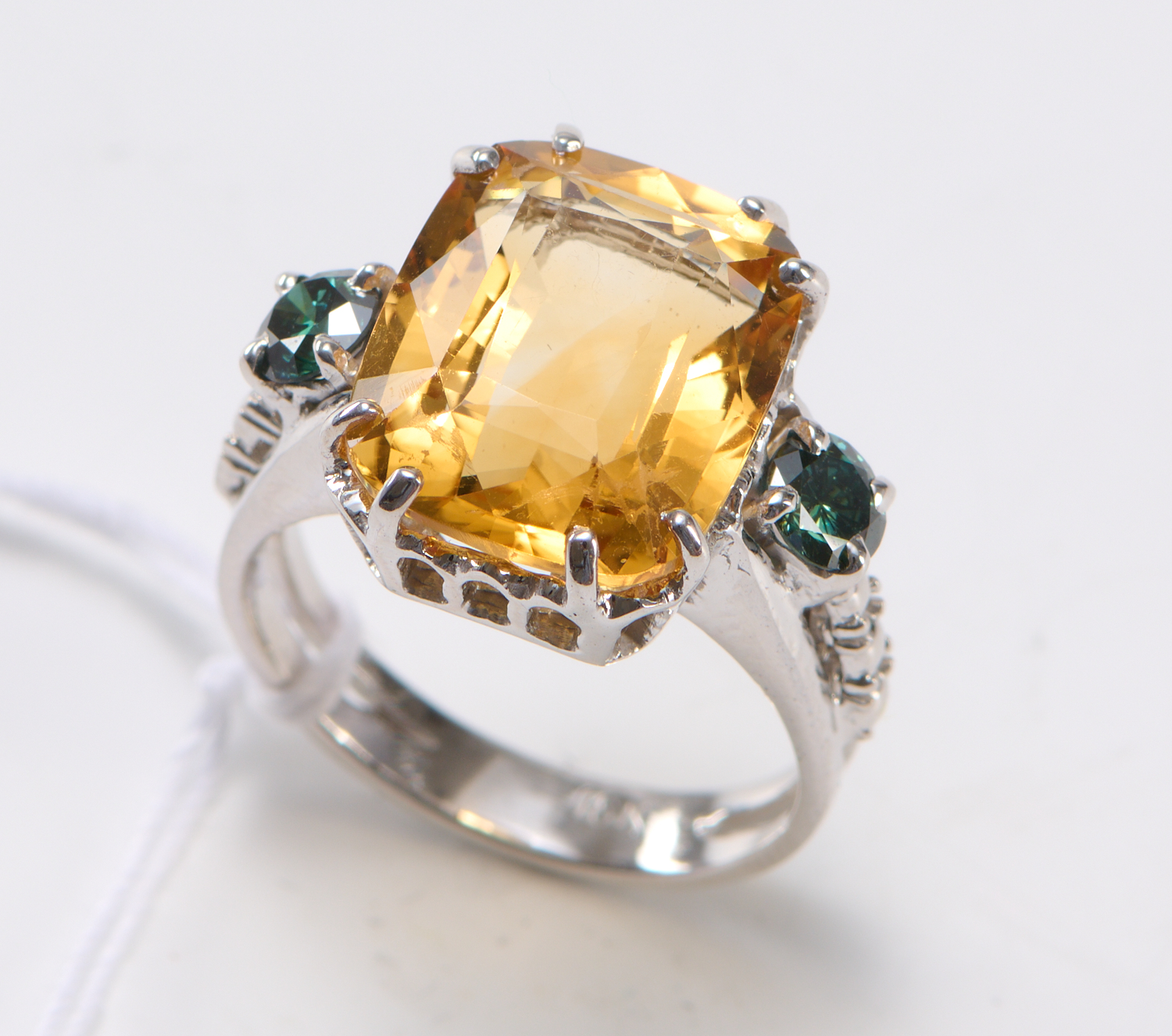 A CITRINE AND GREEN DIAMOND SET RING IN 18CT WHITE GOLD, THE CITRINE WEIGHING 6.65CTS AND THE GREEN DIAMONDS WEIGHING 0.50CTS, SIZE K