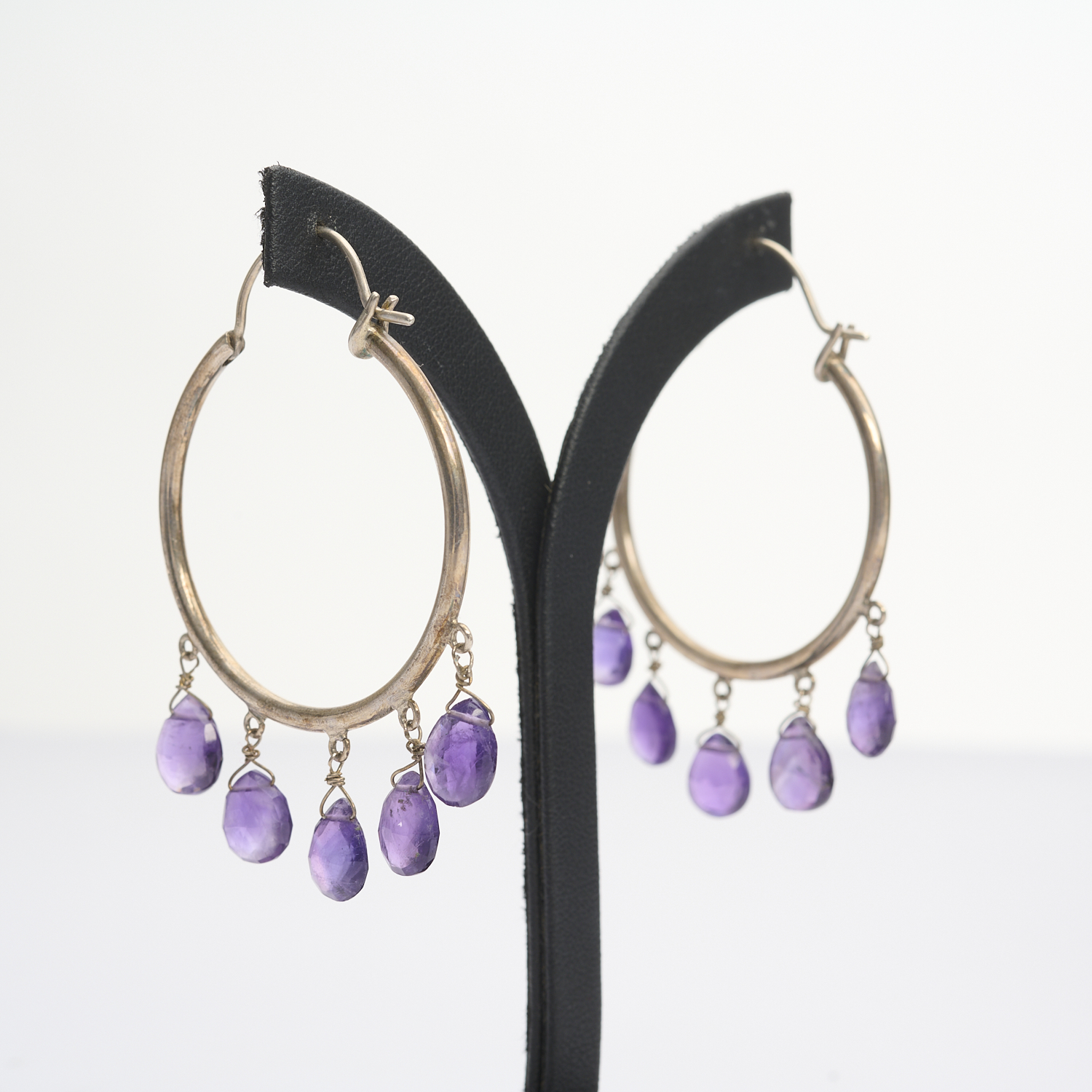 AN AMETHYST SUITE IN STERLING SILVER, COMPRISING A NECKLACE AND CONFORMING HOOP EARRINGS, THE NECKLACE TO A LOBSTER CLASP