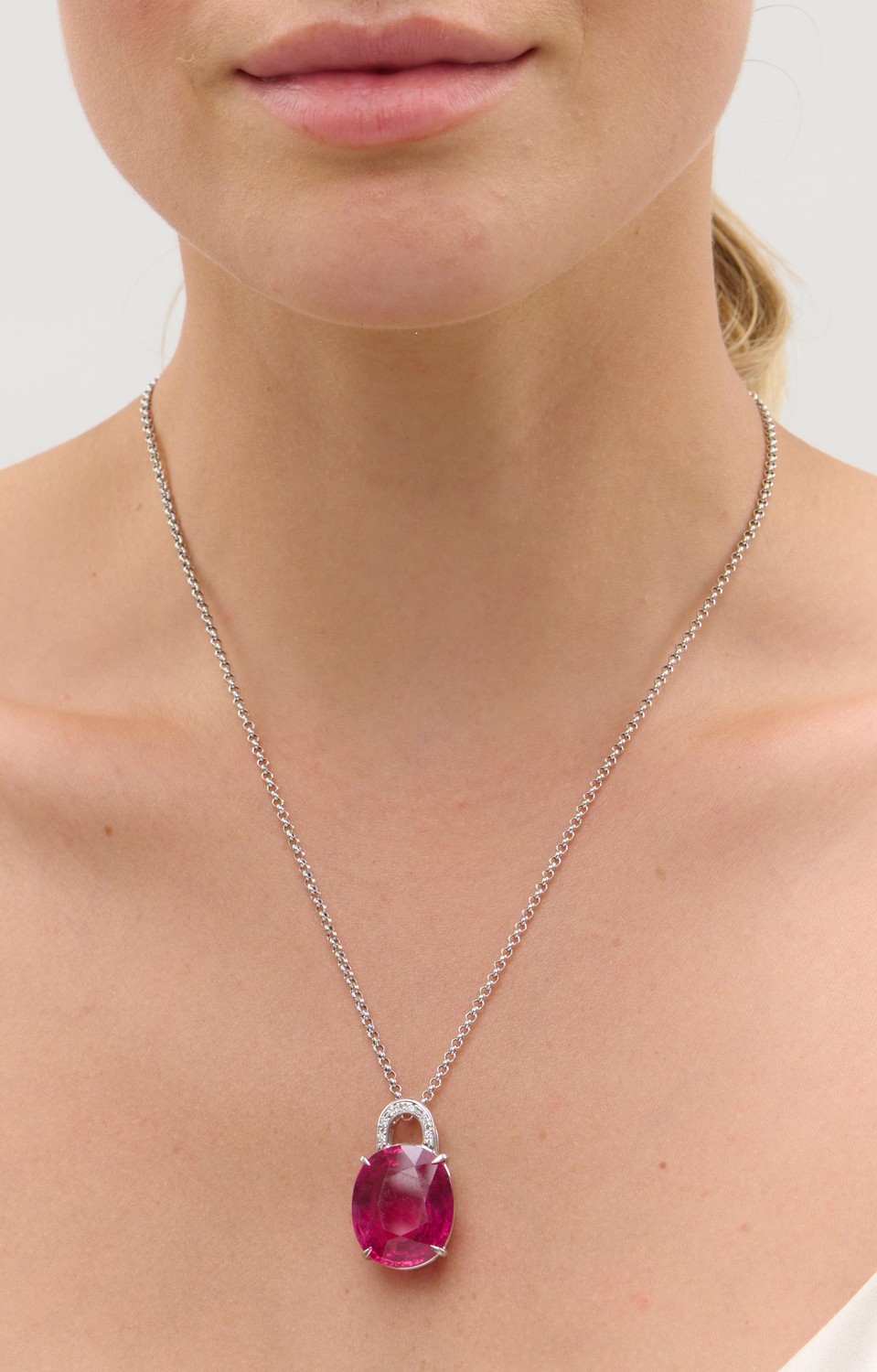 Claw-set with an oval pink tourmaline weighing 22.01 carats, surmounted by an openwork geometric motif pavé-set with brilliant-cut diamonds together weighing approximately 0.07 carat, mounted in 14ct white gold, supported from a belcher link chain, length 30mm, circumference 450mm, adjustable.